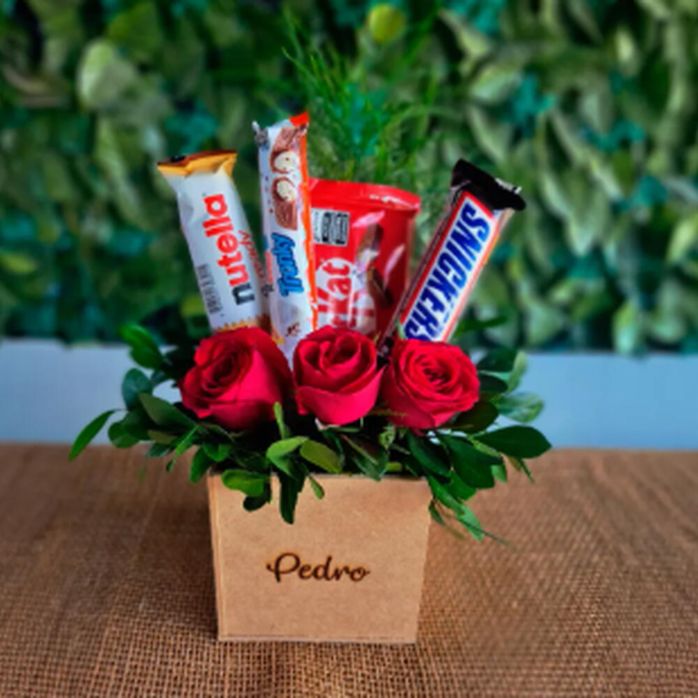 O Box Doce Amor é um presente exclusivo, cuidadosamente montado para transmitir carinho, afeto e doçura de forma única. Este box em MDF, personalizado com o nome do destinatário gravado a laser, é perfeito para surpreender alguém especial. Dentro, um elegante arranjo de três rosas vermelhas é complementado por uma seleção de chocolates irresistíveis, criando um gesto significativo e memorável. As rosas vermelhas, símbolo universal de amor, paixão e respeito, são o coração deste presente. Elas representam a profundidade do sentimento, tornando o Box Doce Amor ideal para ocasiões românticas, como aniversários, datas especiais ou simplesmente para expressar o quanto alguém é importante para você. Além das rosas, o box contém quatro deliciosos chocolates: 1 Kitkat: Um clássico, combinando camadas crocantes de wafer com o cremoso chocolate ao leite. 1 Nutella B-ready: Um doce envolvente com casca crocante, recheado com a irresistível Nutella. 1 Snickers: A perfeita combinação de caramelo, amendoim e chocolate, que oferece uma explosão de sabor. 1 Tronky – Kinder: Um chocolate requintado com wafer crocante e recheio cremoso de chocolate ao leite. Para tornar o presente ainda mais especial, o Box Doce Amor acompanha uma cartinha personalizada, onde você pode expressar seus sentimentos mais sinceros, adicionando um toque pessoal e emocional ao presente. O box é finalizado com celofane e um laço em sisal, garantindo uma apresentação delicada e elegante.