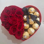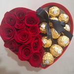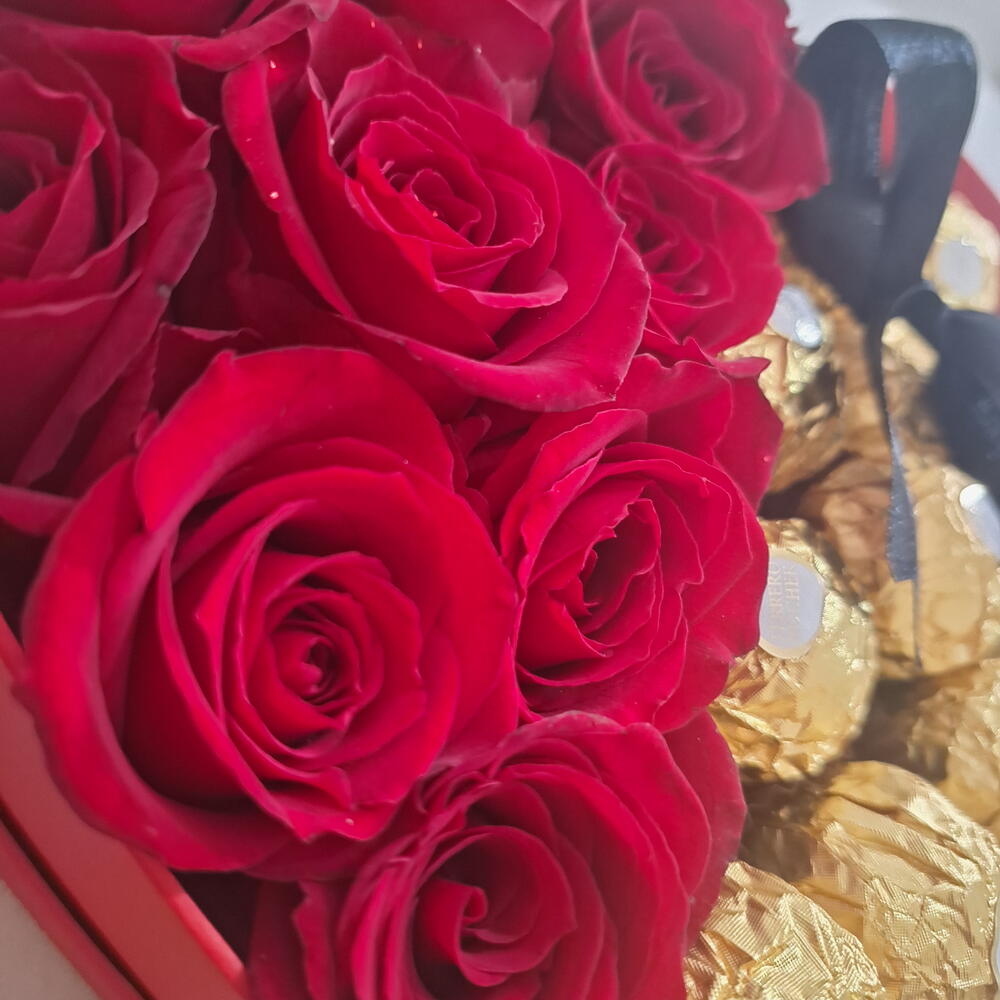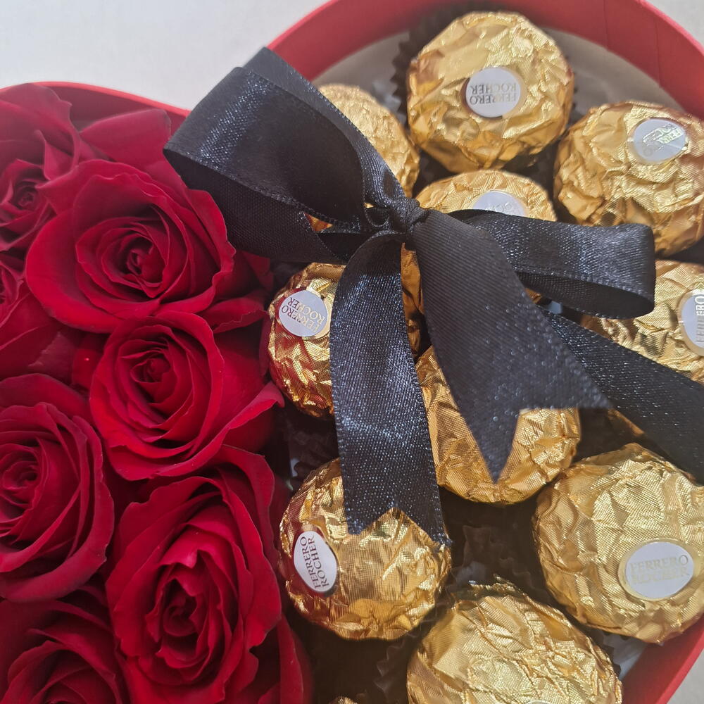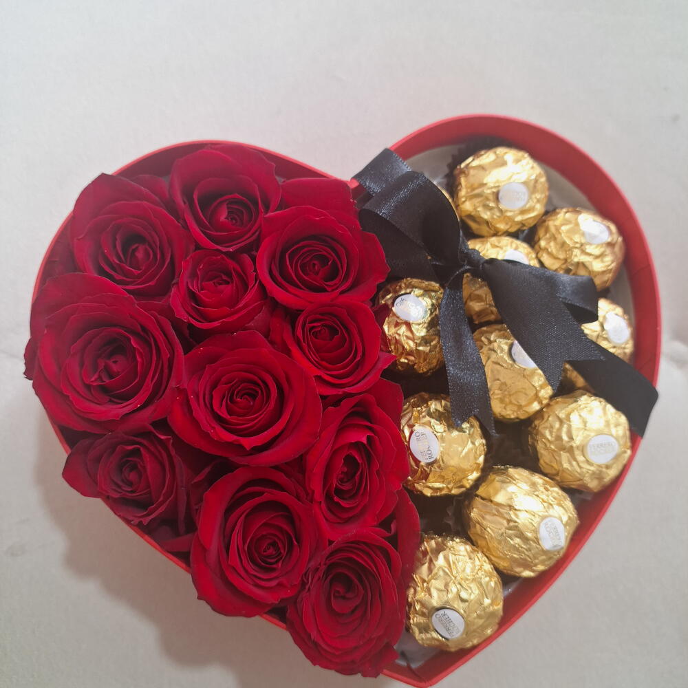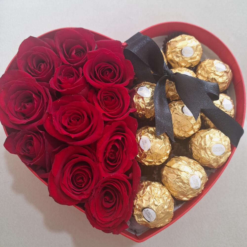 ferrero rocher - 10 un. rosa vermelhas naturais - 8 un. box de coraçao p - 1 un.