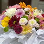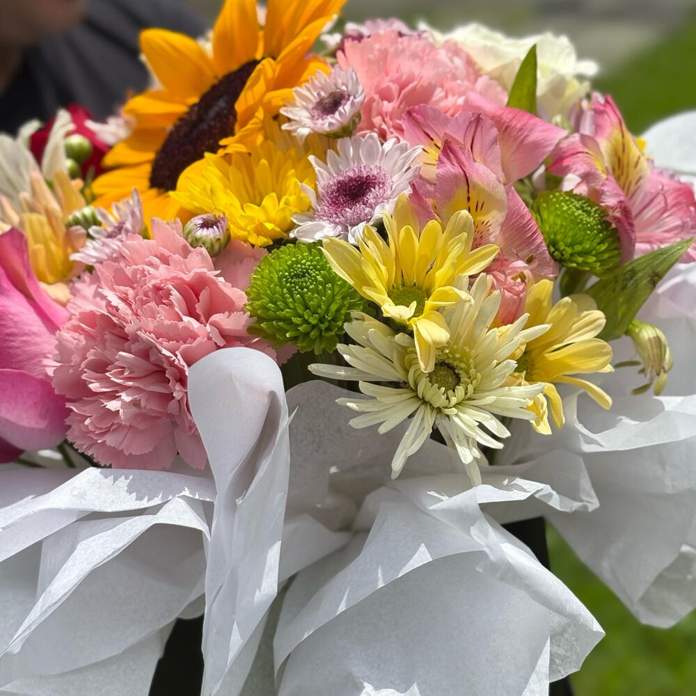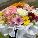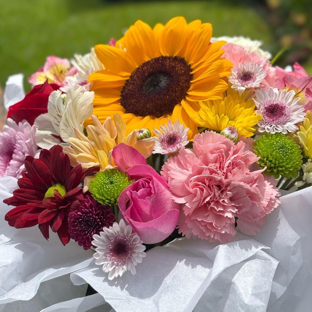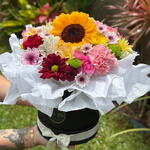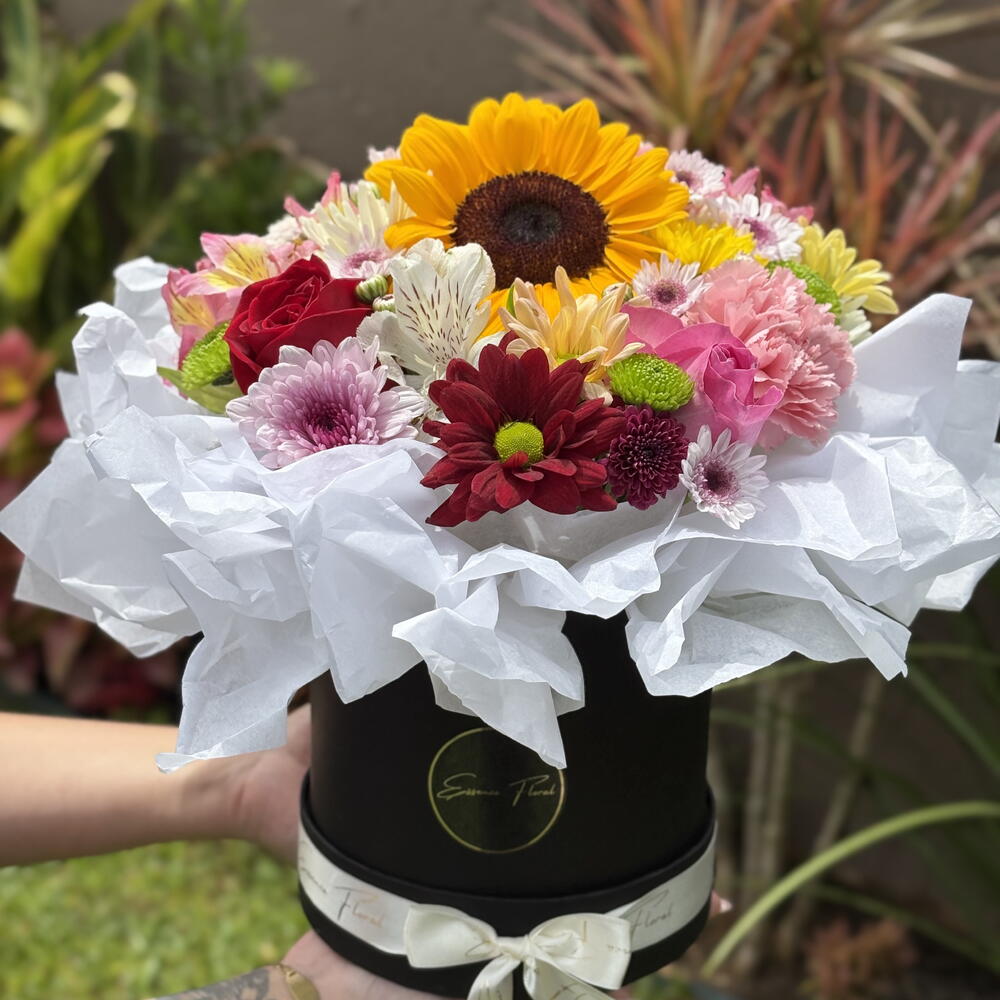 girassol - 1 un. rosa variadas - 1 un. box cartonada - 1 un. flores do campo variadas hastes - 1 un. laço e cartão personalizado - 1 un.