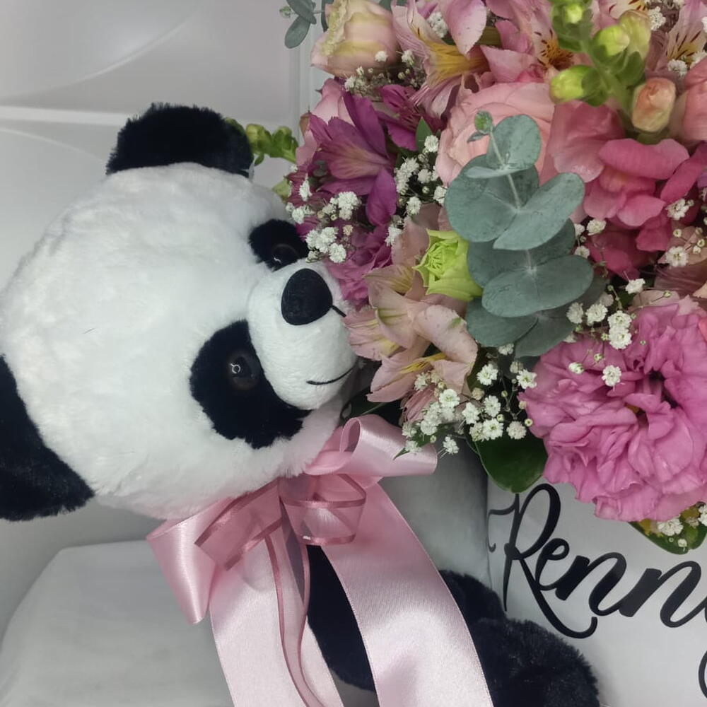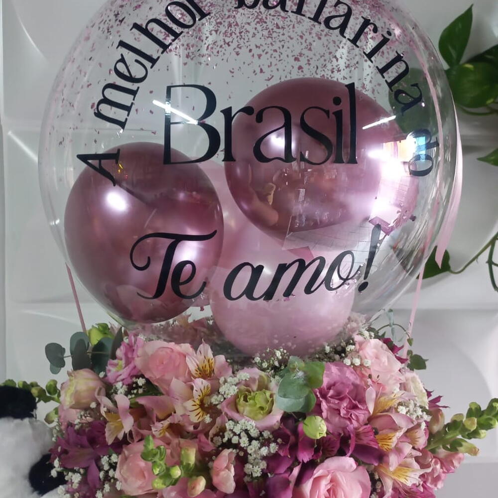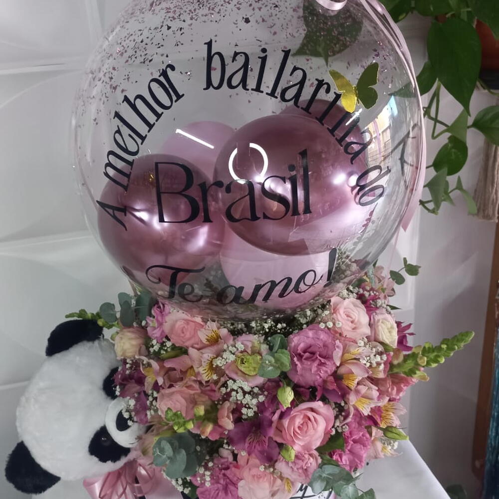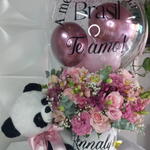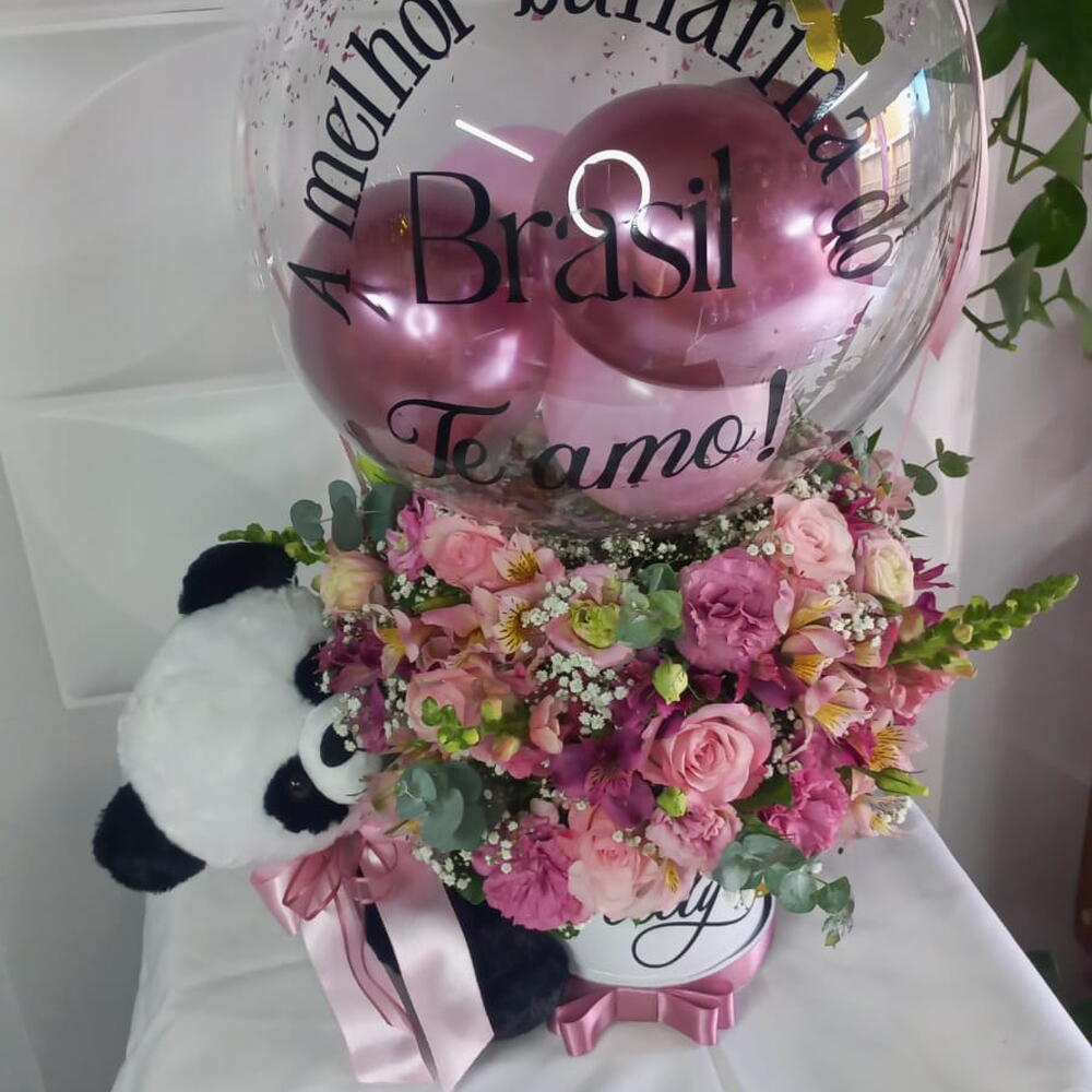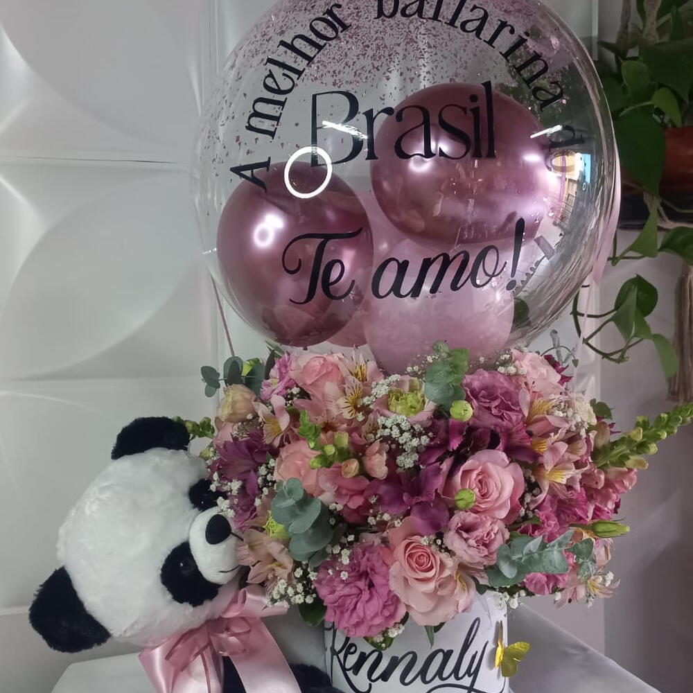 arranjo grande flores mistas - 1 un. caixa cartonada grande personalizada - 1 un. urso de pelucia médio. - 1 un. balão bubble 18 na vareta personalizado (entre em contato com a loja e personalize seu presente do jeito que desejar) - 1 un.