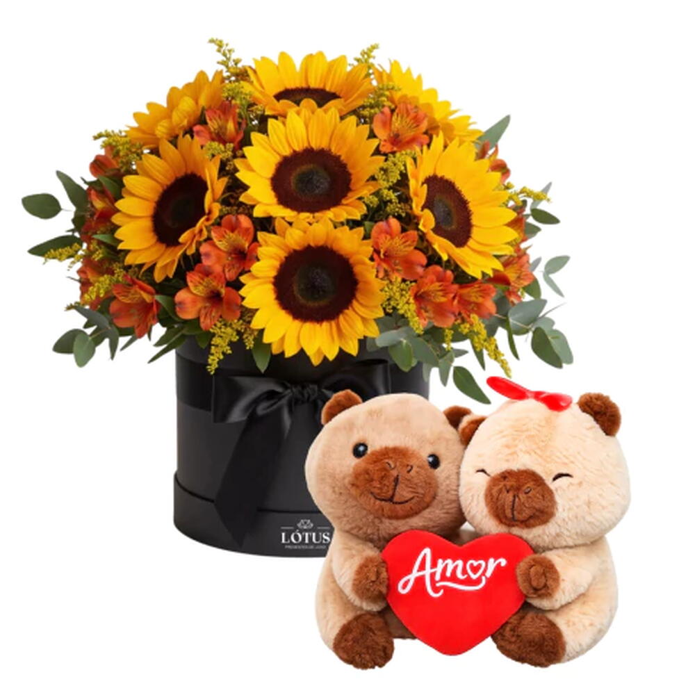 girassol - 7 un. astroméria laranjas - 3 un. pelúcia de capivara com coração “amor” - 1 un.