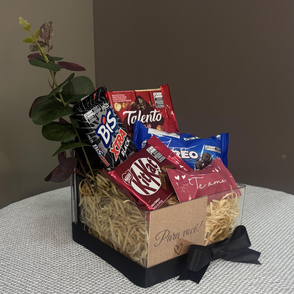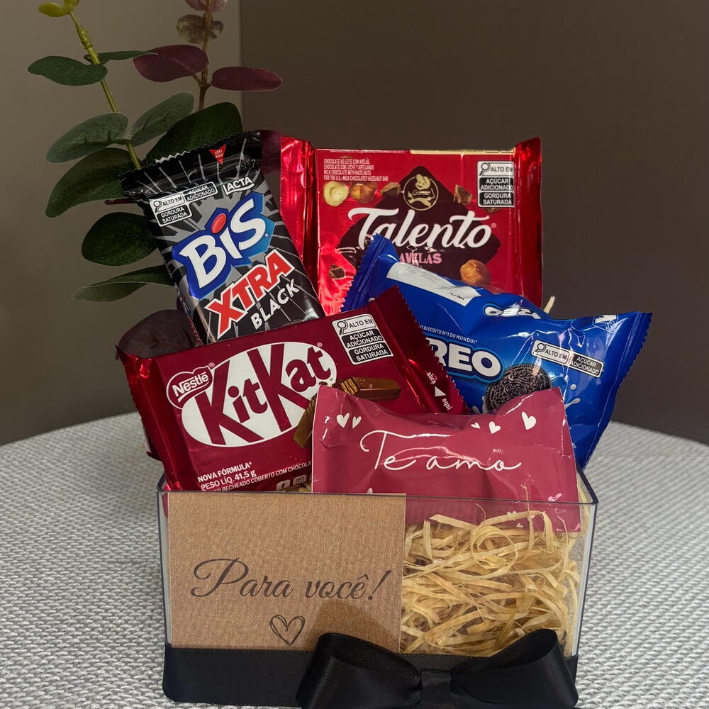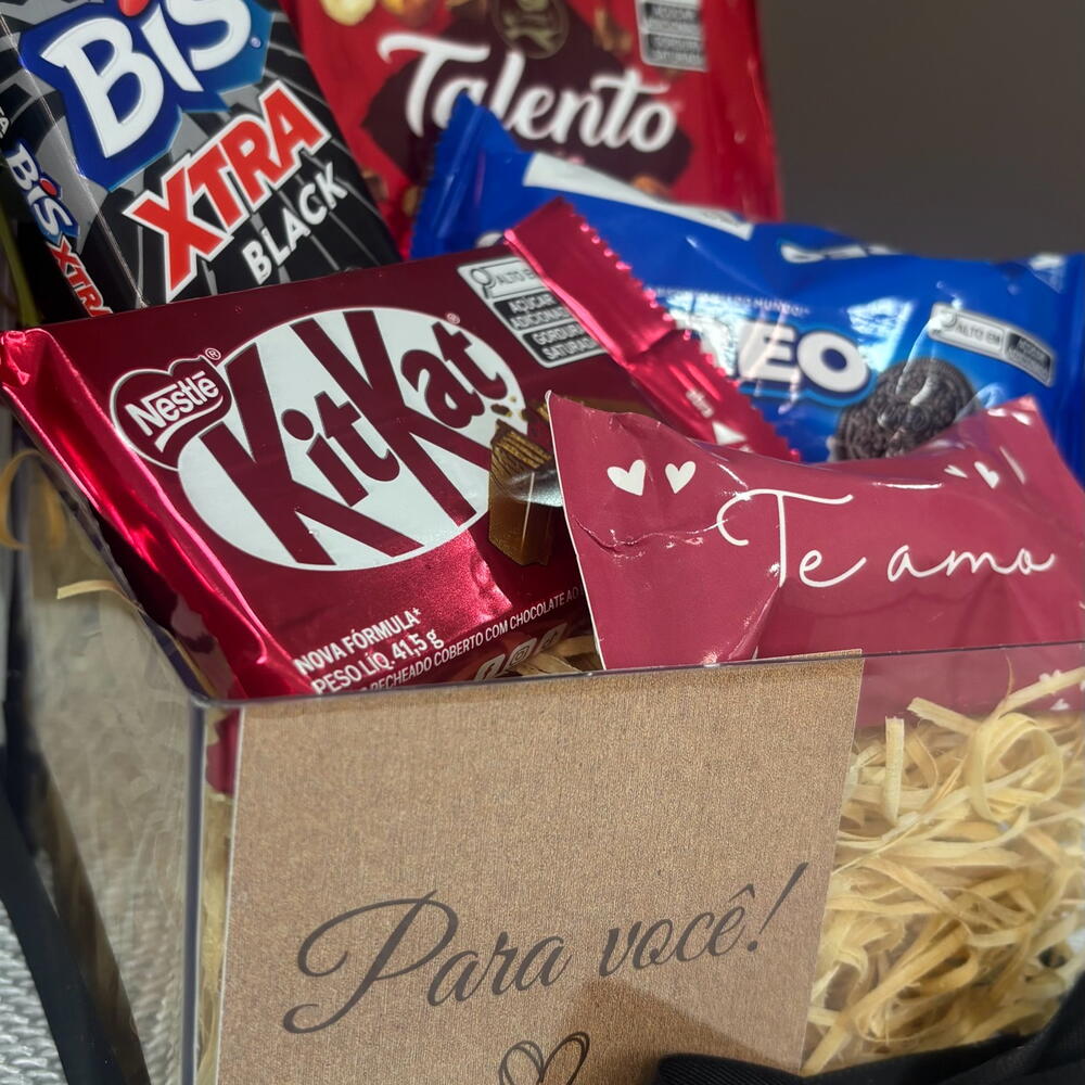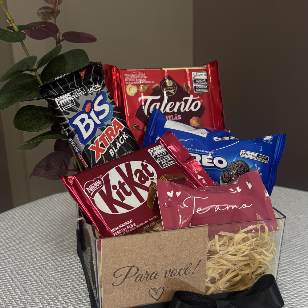 chocolate talento - 1 un. bis xtra 45g - 1 un. oreo 36g - 1 un. kitkat 41g - 1 un. box acrílica decorada - 1 un. bombom sortido adesivado te amo - 1 un.
