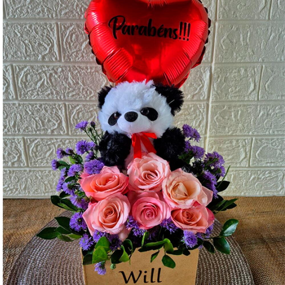 rosa com folhagens - 1 un. o box acompanha uma pelúcia de tamanho médio (15x10 cm) - 1 un. um balão personalizado com o nome - 1 un. caixa de mdf (10x15x15 cm) gravada a laser com o nome - 1 un.