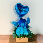 Box Personalizado: Fabricado em MDF com tamanho de 10x15 cm e nome gravado a laser, proporcionando uma personalização única. Arranjo de Rosas: Composto por 6 rosas azuis que simbolizam a profundidade dos sentimentos e a elegância do amor. Stitch Azul: Elemento lúdico que traz charme e remete a histórias de amizade e afeto. Balão Personalizado: Completa o conjunto, elevando o presente a um novo patamar de exclusividade. Cartinha Especial: Permite que você expresse seus sentimentos de forma autêntica e emocionante.