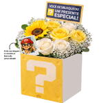 girassol - 1 un. rosa brancas - 3 un. rosa amarelas - 3 un. mosquitinhos - 3 un. foto personalizada - 1 un. cachepô personalizado 12x12 - 1 un. plaquinha decorativa “você desbloqueou um presente especial!” - 1 un.