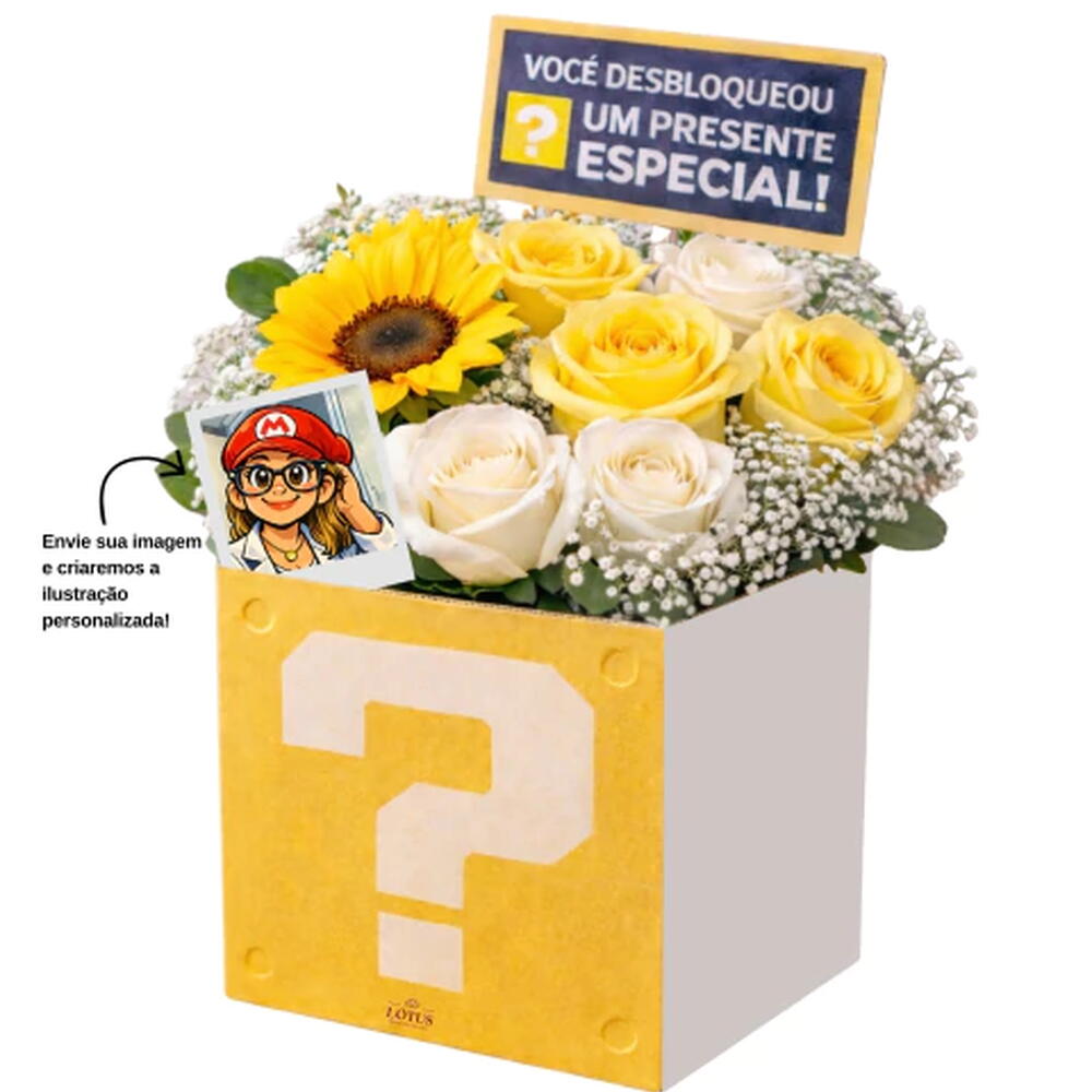 ENCANTE, SURPREENDA, EMOCIONE, COM: Box surpresa temática com girassol, rosas amarelas e brancas, perfeita para quem ama presentes criativos, divertidos e cheios de significado. ITENS QUE COMPÕEM O SEU PRESENTE 1 girassol 3 rosas amarelas 3 rosas brancas mosquitinhos Cachepô personalizado 12x12 Plaquinha decorativa “Você desbloqueou um presente especial!” Foto personalizada