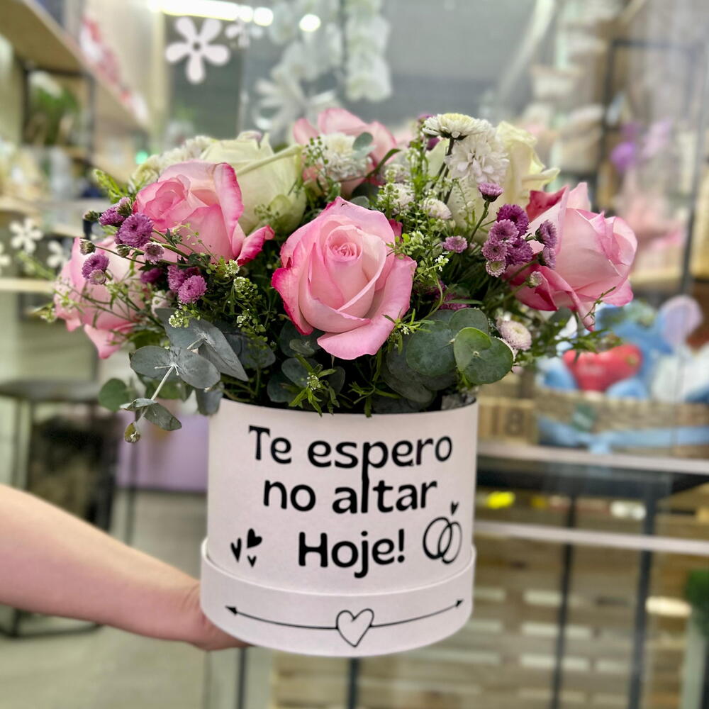🌹✨ Box Floral – Te espero no altar hoje! ✨🌹 Um presente romântico e inesquecível para marcar um dos dias mais especiais da vida a dois. Este box exclusivo traz a delicadeza das rosas em tons de rosa e branco, combinadas com flores campestres e folhagens, criando um arranjo sofisticado e cheio de emoção. 💍 Diferenciais: ✔ Design exclusivo com a mensagem “Te espero no altar hoje!” ✔ Flores frescas e selecionadas com carinho ✔ Combinação romântica de cores que simbolizam amor, pureza e cumplicidade ✔ Presente perfeito para pedidos de casamento, surpresa no grande dia ou momentos de celebração do amor 💝 Mais do que flores, é uma declaração de amor que eterniza lembranças e emociona em cada detalhe. 👉 Ideal para surpreender no dia do casamento ou noivado, tornando o momento ainda mais inesquecível.