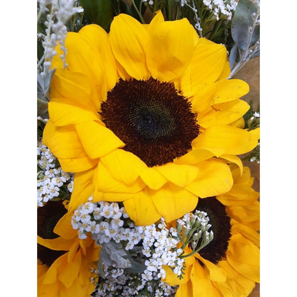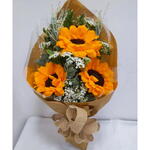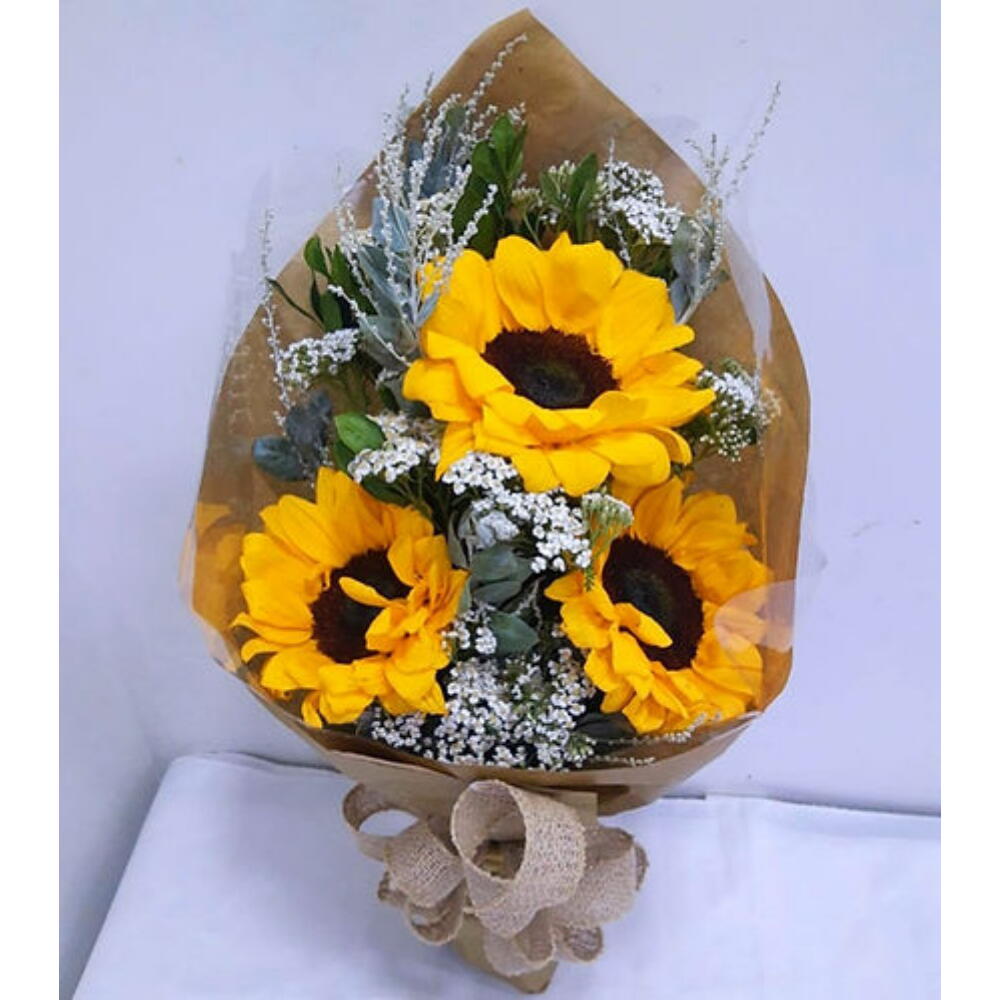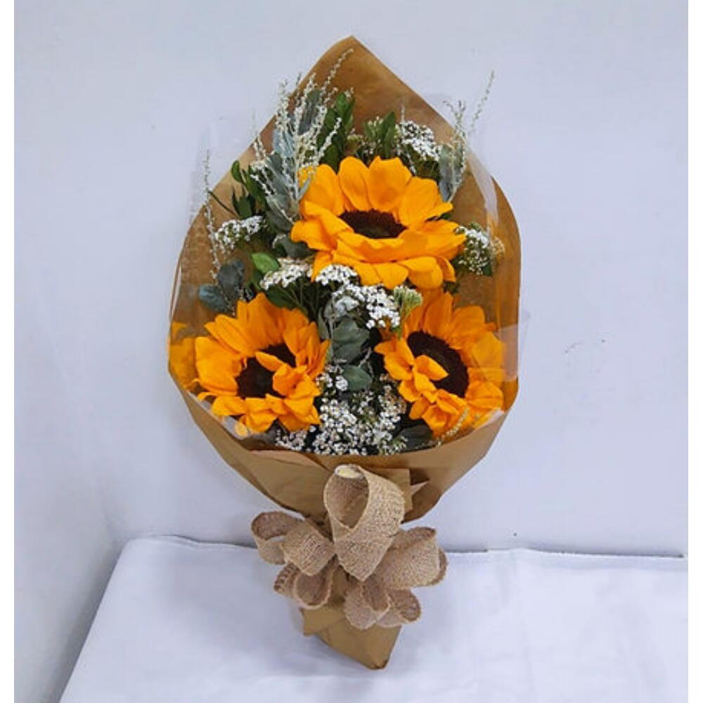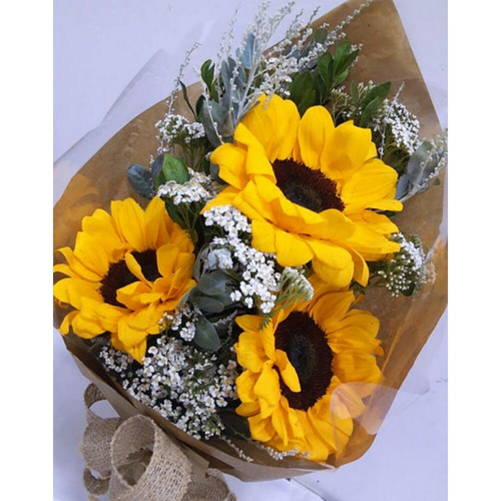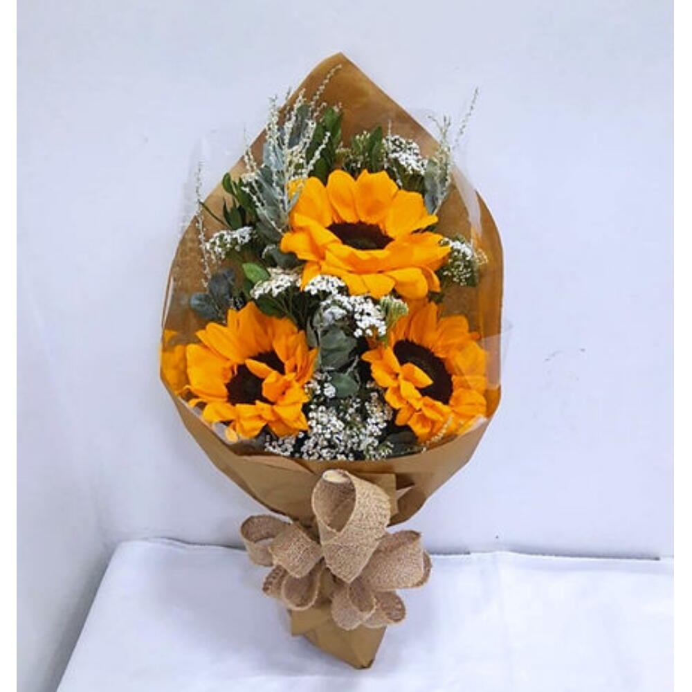 Este arranjo encantador traz um bouquet de 3 girassóis resplandecentes, habilmente dispostos entre uma seleção de folhagens e complementos. Apresentado em uma elegante embalagem de presente, completa com um charmoso laço, este arranjo de flores transmite alegria e otimismo, tornando-o perfeito para qualquer ocasião ou simplesmente para alegrar o dia de alguém.