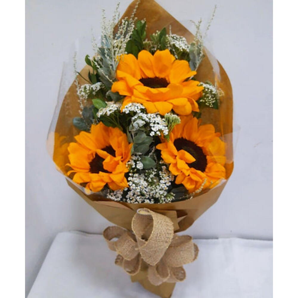 girassois - 3 un. folhagens e complementos - 1 un. embalagem para presente com laco - 1 un.