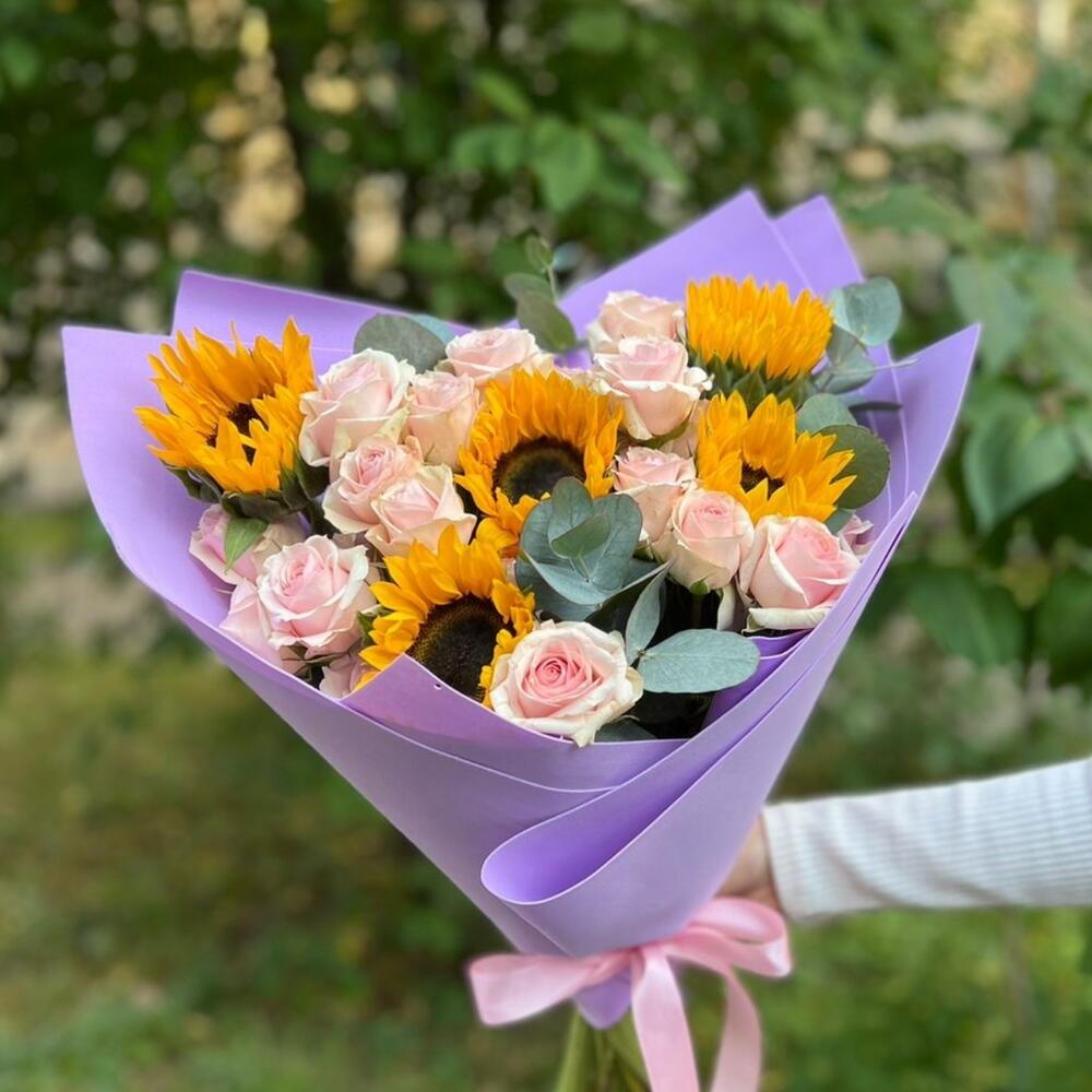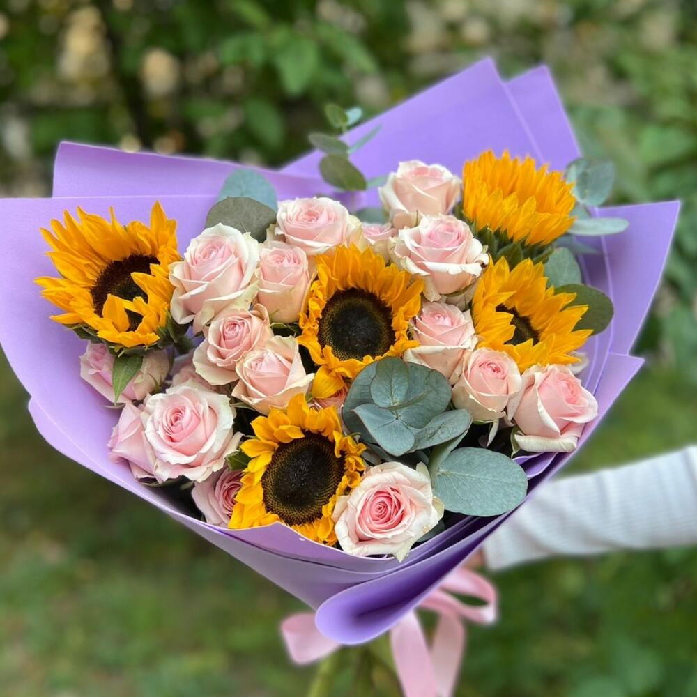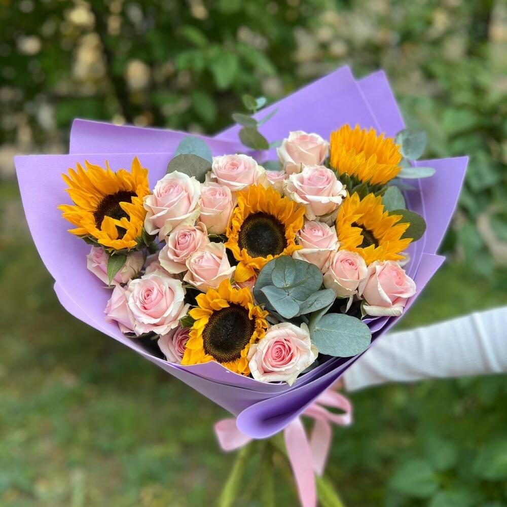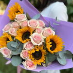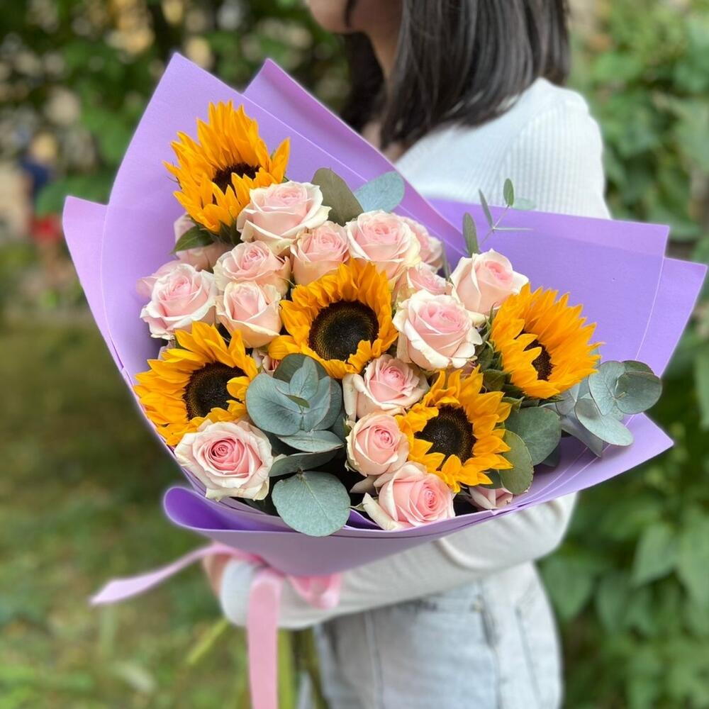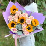 rosa - 4 un. embalagem personalizada - 1 un. eucalípto - 3 un. girassol - 5 un.