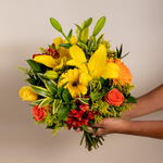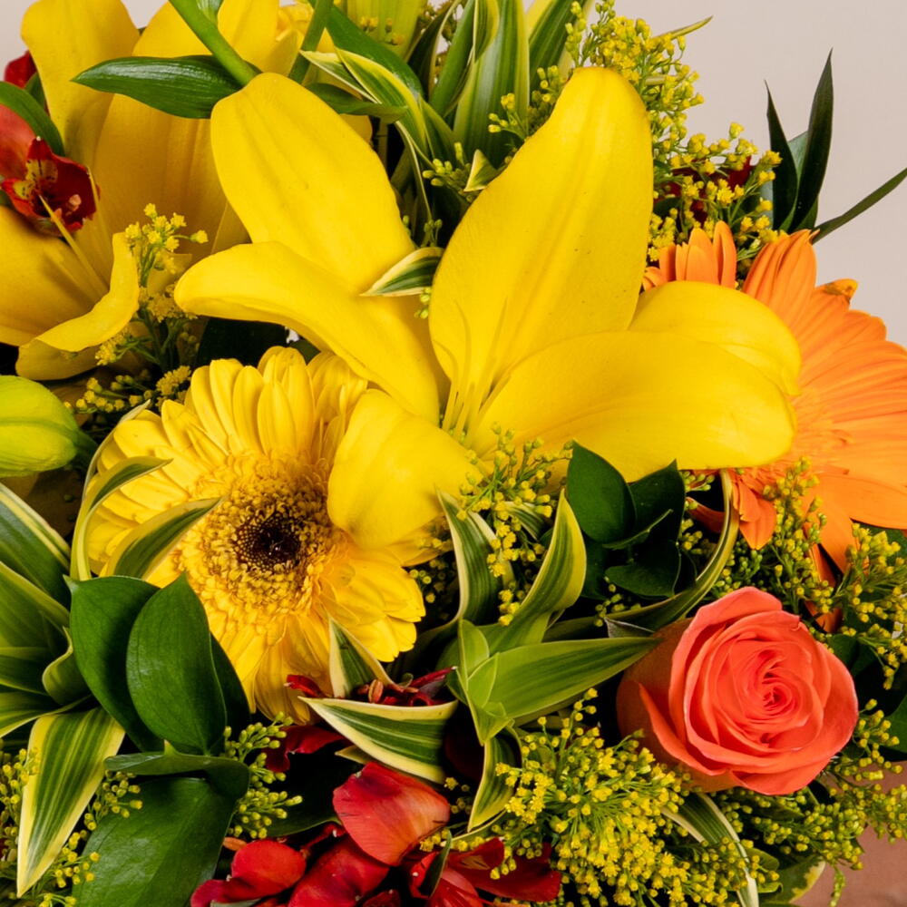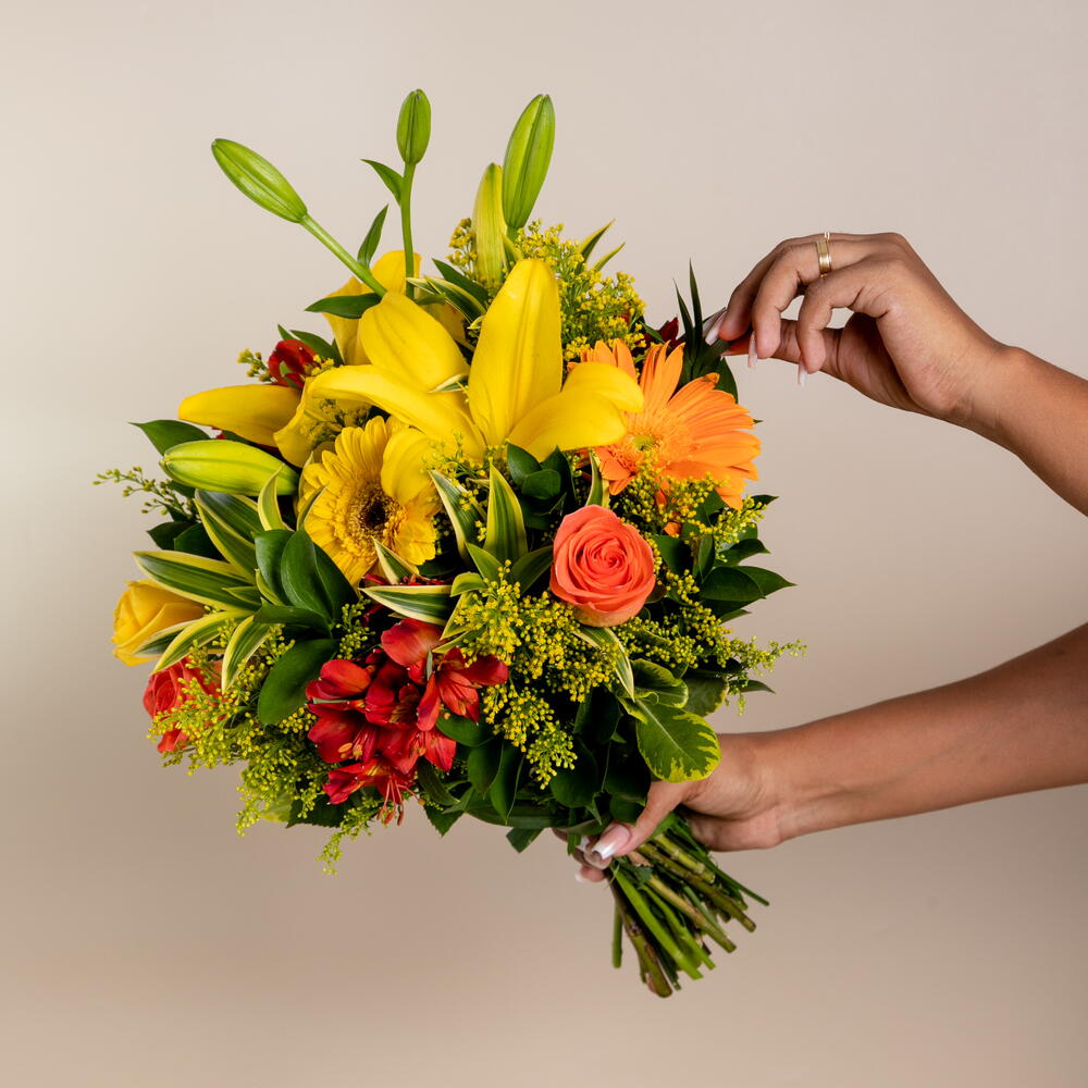Encantador, elegante e marcante! Nosso buquê é composto por rosas, gérberas, astromélias e lírios em tons de amarelo, laranja e vermelho. Com folhagens nobres e embalagem especial, nosso buquê é confeccionado por nossos floristas e entregue para quem você ama com todo cuidado e carinho.