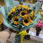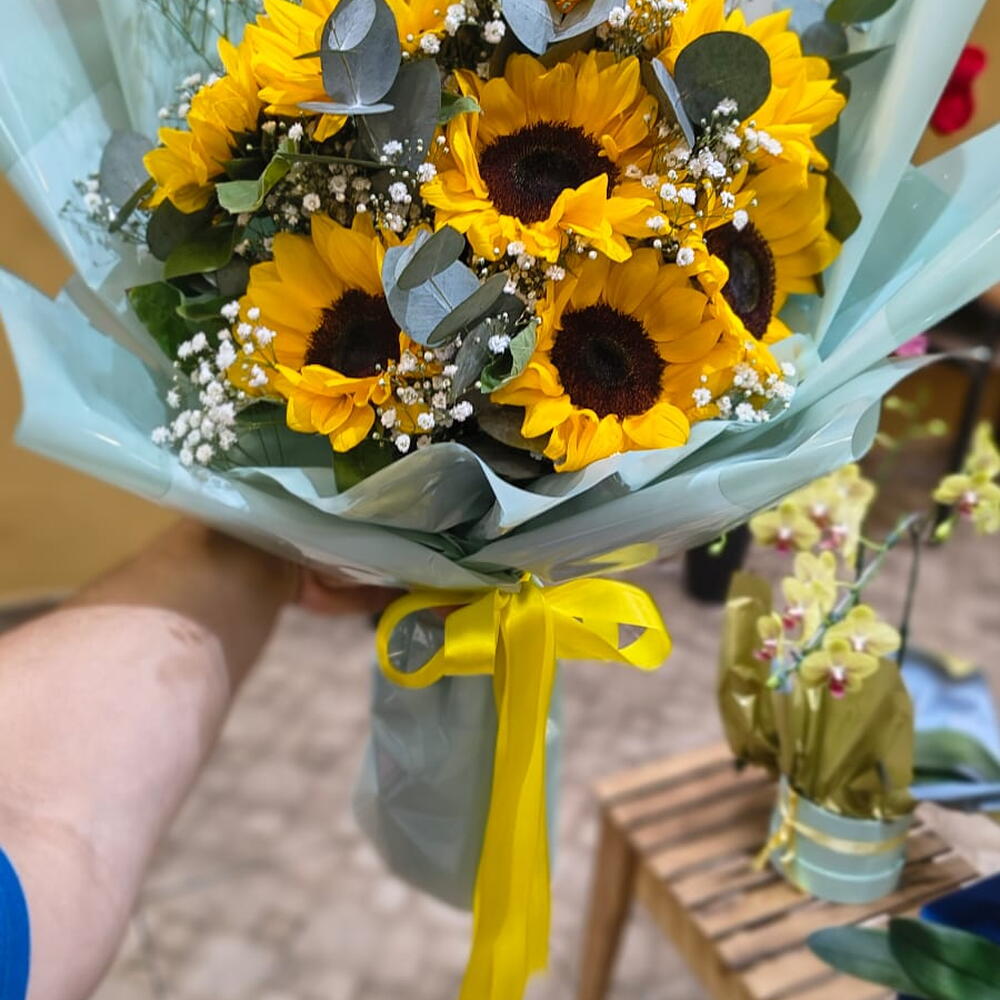 Descubra a alegria em cada pétala com nosso elegante buquê composto por 8 girassóis radiantes, conhecidos por simbolizar a felicidade e a vitalidade, acompanhados de 5 unidades de Chuva de Prata, que acrescentam um toque delicado ao conjunto. Este belo e vibrante buquê certamente acrescentará um charme único à qualquer ocasião.