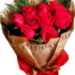 folhagens - 4 un. rosa vermelhas - 10 un. cartão de mensagem - 1 un. laço em cetim - 1 un. embalagem presente modelo jornal - 1 un.