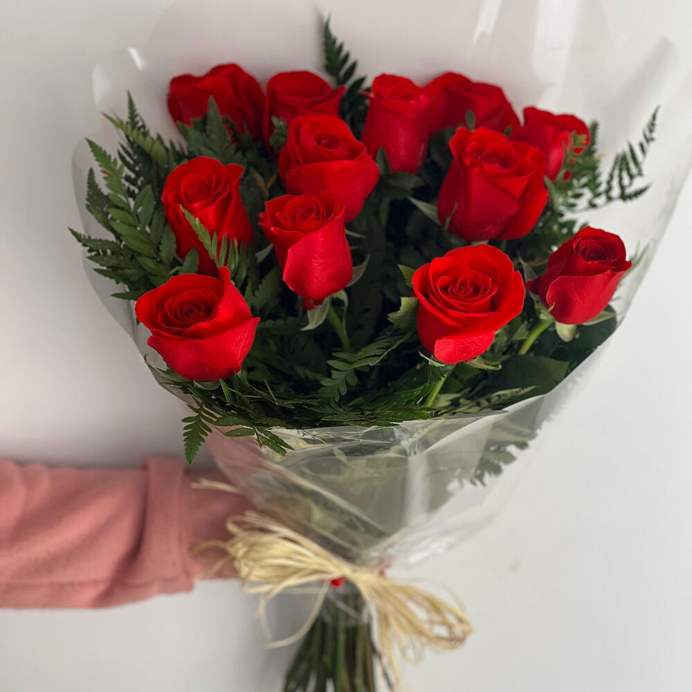 rosa - 12 un. embalagem - 1 un. folhagens - 1 un. laço - 1 un.