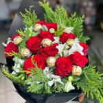 ferrero rocher - 8 un. gipsofila - 10 un. rosa vermelhas - 12 un. alstroemerias (verificar disponibilidade de cores) - 10 un. folhagens verdes que realçam a beleza das flores e acrescentam frescor ao arranjo - 12 un. laço decoração - 1 un. embalagem dobradura - 1 un.