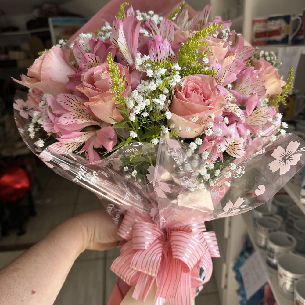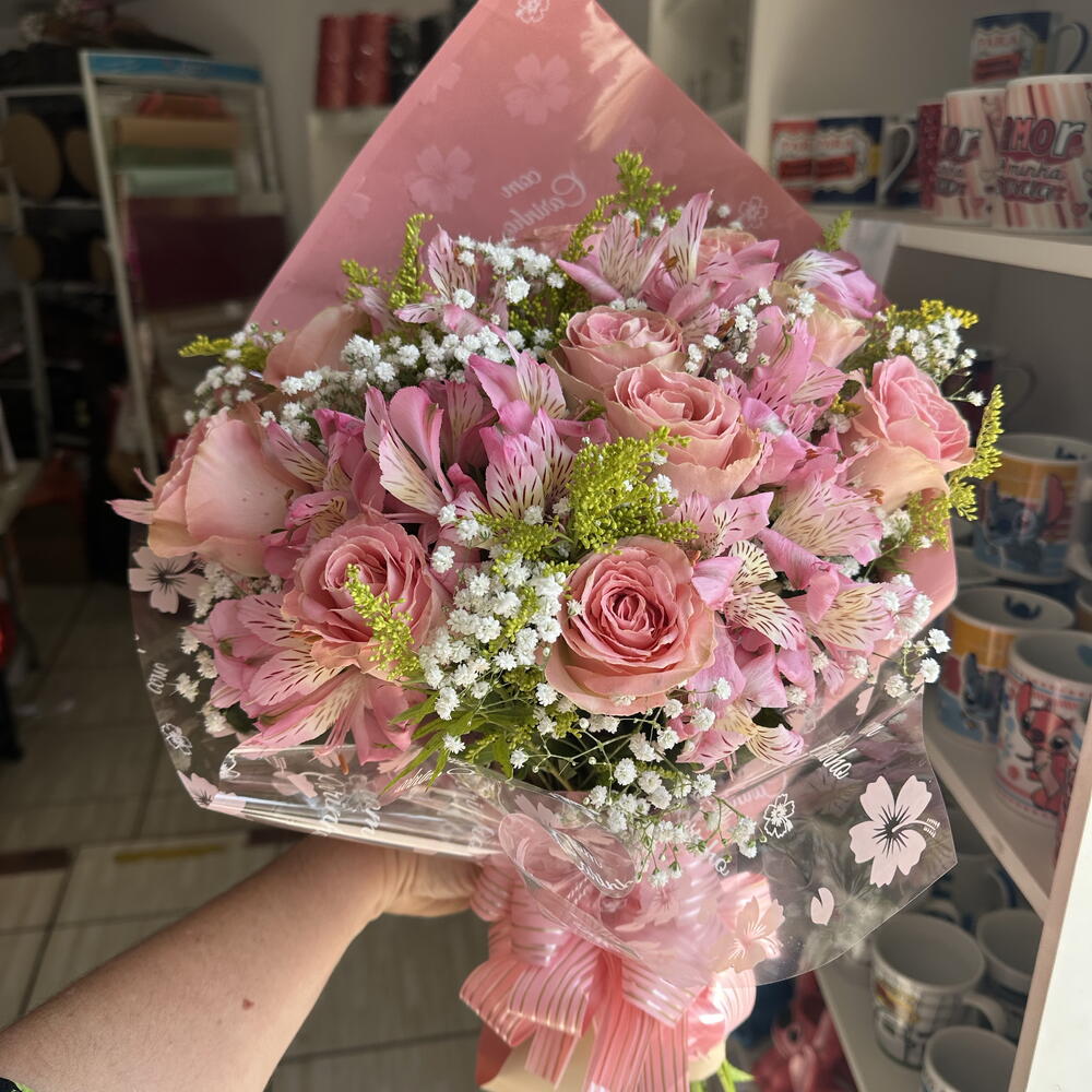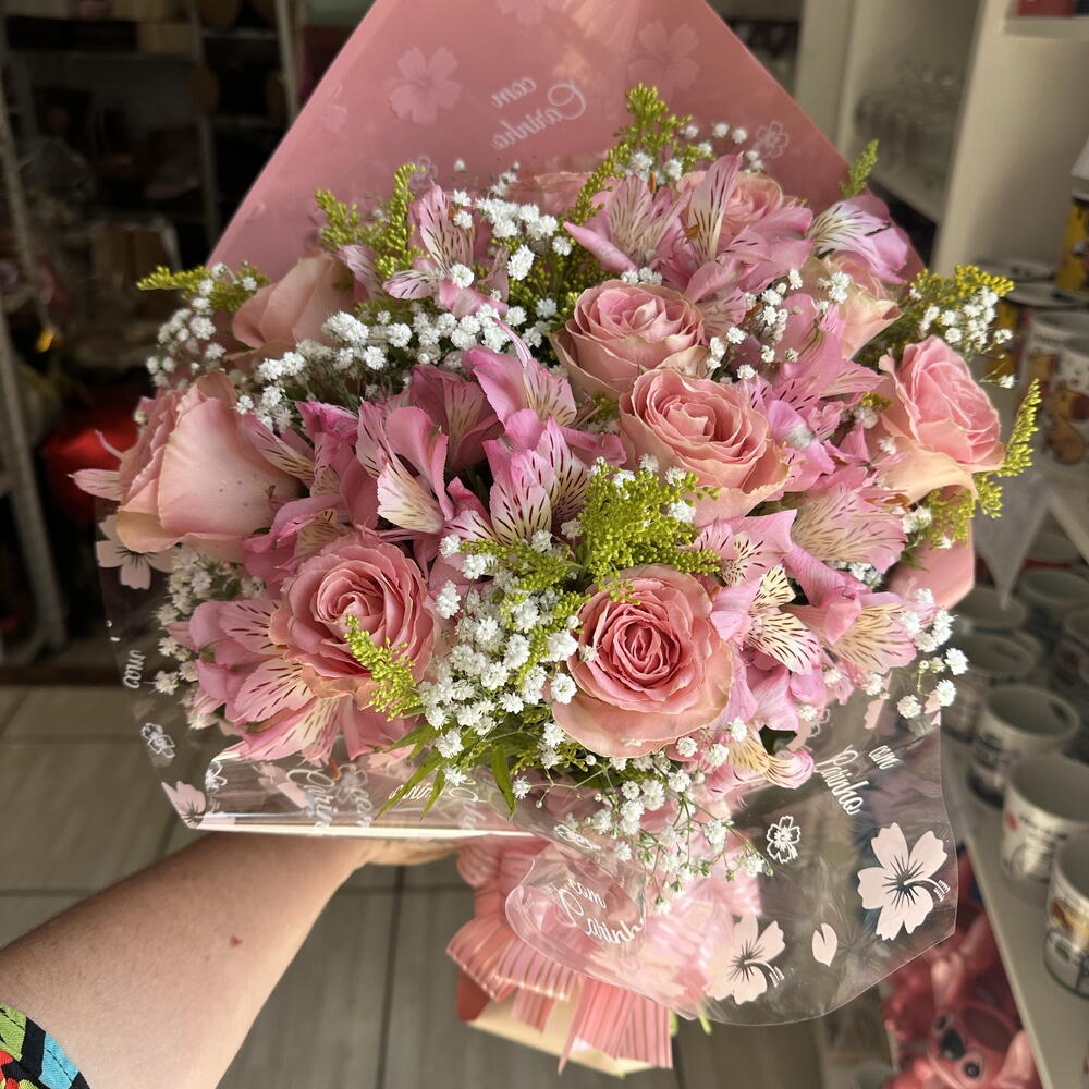 gipsofila - 10 un. rosa rosa - 12 un. embalagem especial - 1 un. alstroemerias (verificar disponibilidade de cores) - 10 un. folhagens verdes que realçam a delicadeza das rosa e acrescentam frescor ao arranjo - 10 un. laço para decorar - 1 un.