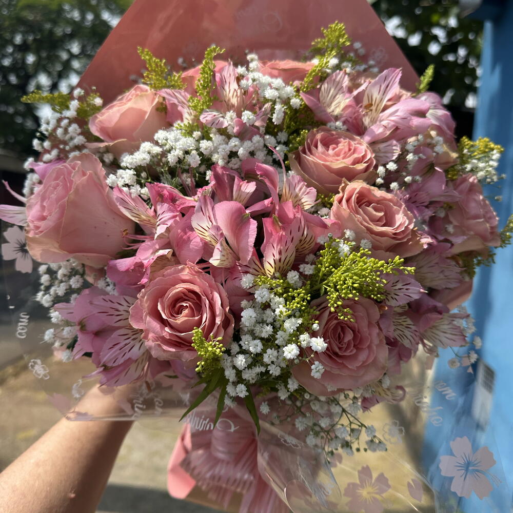 Este buquê apaixonante é composto por 12 rosas rosas, delicadamente acompanhadas por 10 unidades de gipsofila e alstroemerias (as cores destas podem variar conforme a disponibilidade). Além disso, folhagens verdes amplificam a delicadeza das rosas, trazendo frescor ao arranjo. A embalagem especial garante a preservação e aparência encantadora do buquê, enquanto um laço para decoração adiciona o toque final de elegância. Uma escolha perfeita para expressar sentimentos de amor, apreciação e alegria.
