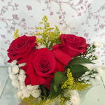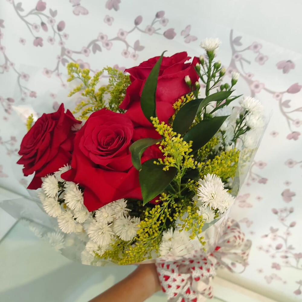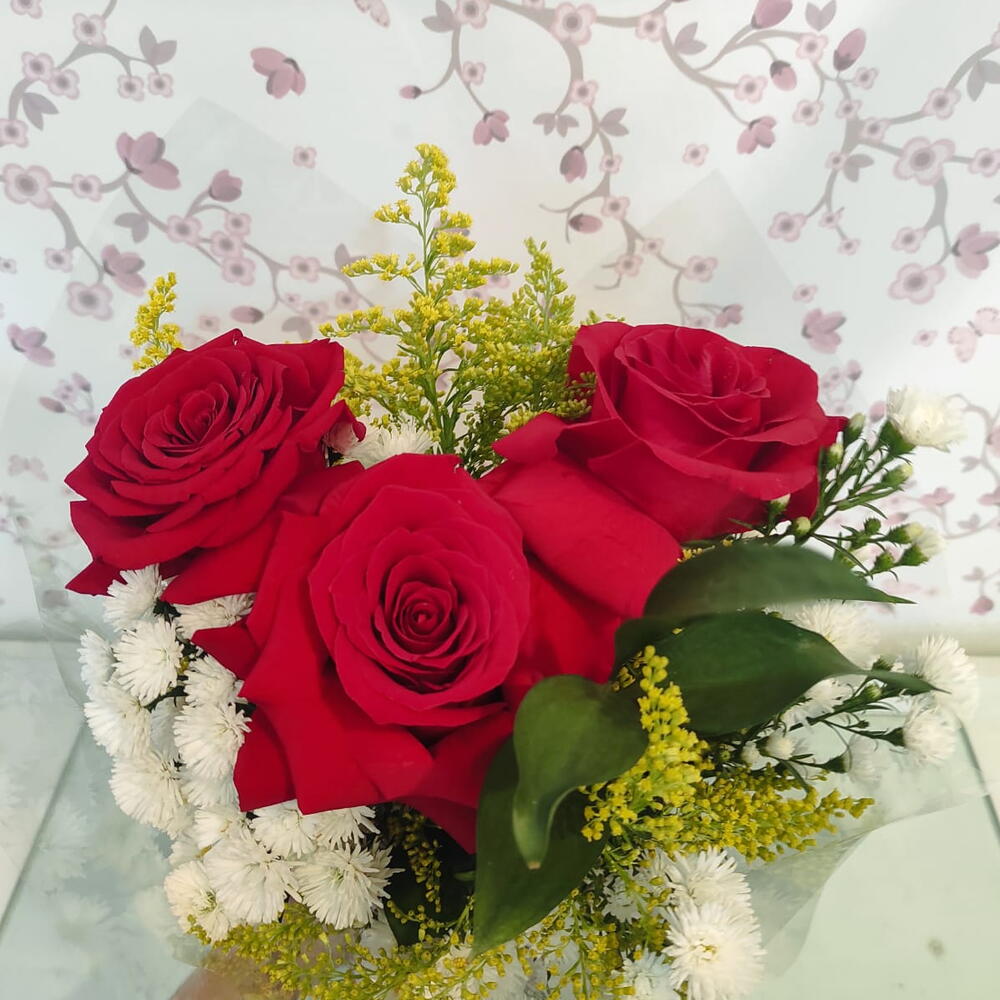 Este buquê é perfeito para demonstrar seu amor e atenção a alguém especial. Composto por três rosas vermelhas, afamadas pela sua beleza resplandecente, e enriquecido com folhagens variadas para um toque de frescura e naturalidade. O arranjo é finalizado com cuidado em uma embalagem sofisticada, completada com um laço elegante. Uma escolha maravilhosa para ocasiões românticas ou simplesmente para alegrar o dia de alguém querido. Obs: folhagens, embalagem e laço podem haver variações de cores e estampas de acordo com a disponibilidade do dia.