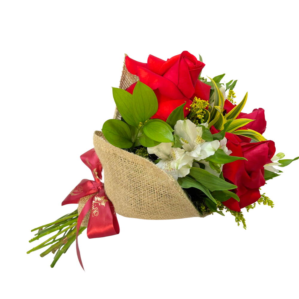 Este buquê encantador combina elegância e paixão em um design incrível. Composto por 3 deslumbrantes rosas vermelhas colombianas, complementadas com uma única, mas expressiva astromélia. As folhagens e complementos adicionam um toque de vivacidade e frescura. Embrulhado cuidadosamente em celofane transparente e juta para manter sua forma e frescor, este buquê é finalizado com um delicado laço de cetim para um toque extra de sofisticação. Perfeito para expressar o seu amor e apreço em qualquer ocasião, seja um aniversário, Dia dos Namorados ou apenas para dizer eu te amo.