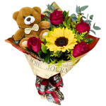 Encante quem você ama com nosso belo buquê, composto por 4 rosas vermelhas vibrantes que simbolizam amor e paixão. O arranjo inclui também um girassol radiante, transmitindo força e alegria. Acompanha uma adorável pelúcia de urso, tornando o presente mais especial e cativante. Tudo isso embalado com elegância e sofisticação para tornar seu presente inesquecível. Ideal para expressar sua admiração e carinho em qualquer ocasião. Floricultura Salas