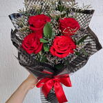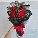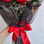 Este elegante buquê é composto por um delicado laço de cetim, proporcionando um toque de sofisticação. Ele inclui quatro rosas vermelhas importadas, cuidadosamente selecionadas por seu frescor e beleza excepcionais. Um acréscimo de uma flor do campo adiciona um toque rústico e charmoso, enquanto a folhagem cuidadosamente escolhida cria um belo contraste de cores e texturas. Para completar, uma folha de poli na cor escolhida pela nossa florista de acordo com a disponibilidade em estoque, conferindo um estilo único a cada buquê. Uma opção perfeita para presentear alguém especial ou para decorar seu ambiente preferido.