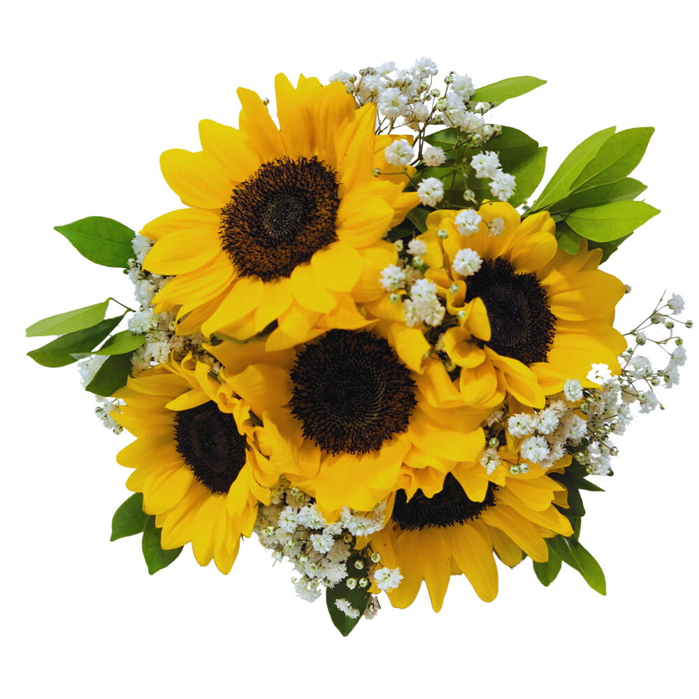 girassol - 5 un. laço em fitas de cetim - 1 un. urso de pelucia com coração - 1 un. gipsonphyla - 5 un. papel sujinho - 1 un.