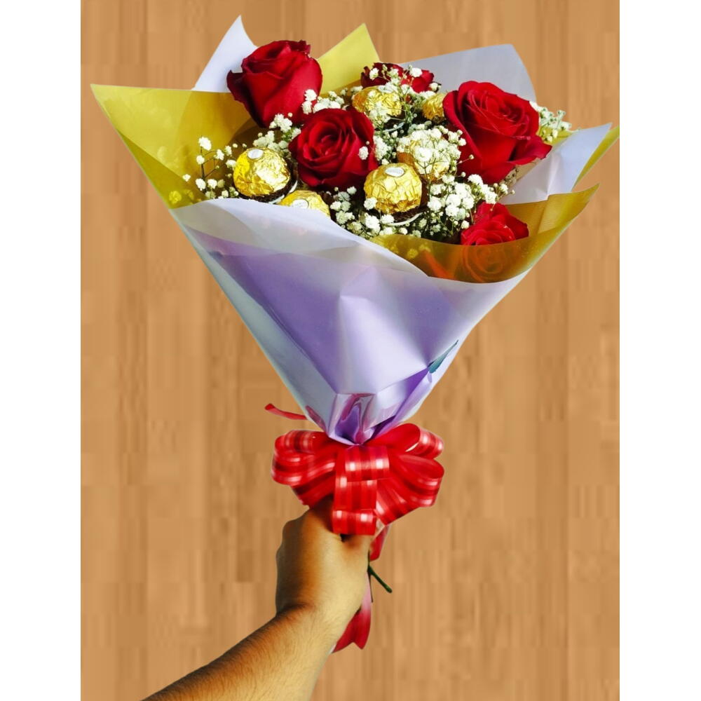 Buquê 5 Rosas e 3 Ferrero Rocher