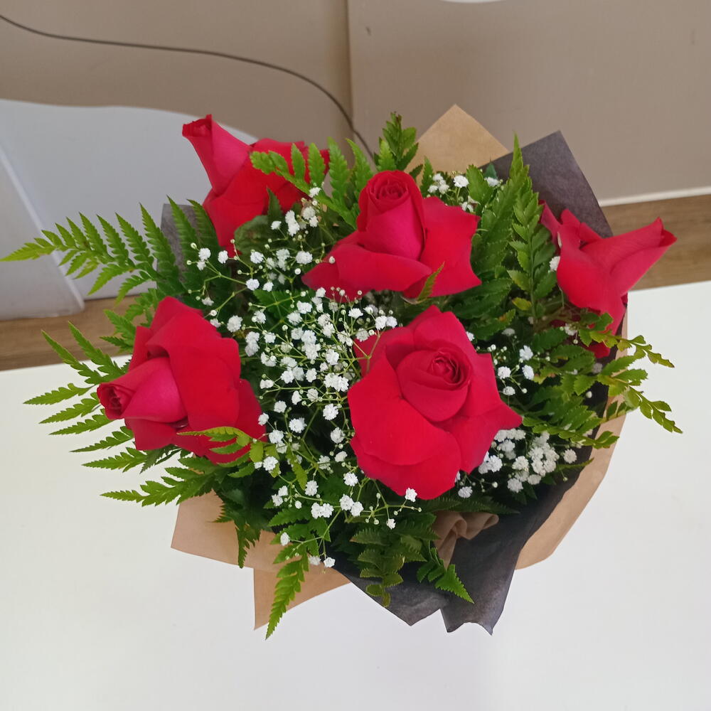 Este belo buquê é cuidadosamente composto por 5 unidades de rosas vermelhas, elegantemente envolvidas numa embalagem única. O arranjo é finalizado com um toque de elegância com um laço ornamental e folhagens para enriquecer sua beleza natural. Perfeito para expressar o seu amor ou demonstrar o seu apreço, este buquê de rosas vermelhas é garantido para trazer um sorriso ao rosto de qualquer pessoa.