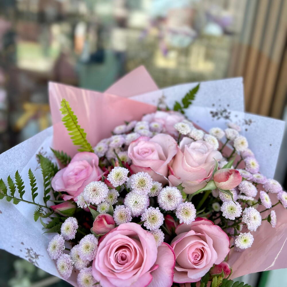 Lindas rosas cor-de-rosa, acompanhadas de belas folhagens. Embalagem especial, tags e cartão incluídos, com um laço encantador. Presenteie com elegância e amor. OBS: * A COR DA EMBALAGEM E ORNAMENTOS PODEM VARIAR DE ACORDO COM O ESTOQUE.