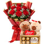 ENCANTE, SURPREENDA, EMOCIONE, COM: Buquê clássico de rosas vermelhas com pelúcia de capivara apaixonada e caixa de bombons Ferrero Rocher. Um presente completo, romântico e irresistível para declarar amor em grande estilo. ITENS QUE COMPÕEM O SEU PRESENTE Buquê de 7 rosas 1 pelúcia de capivara com coração “Amor” Caixa de bombons Ferrero Rocher de 8 unidades