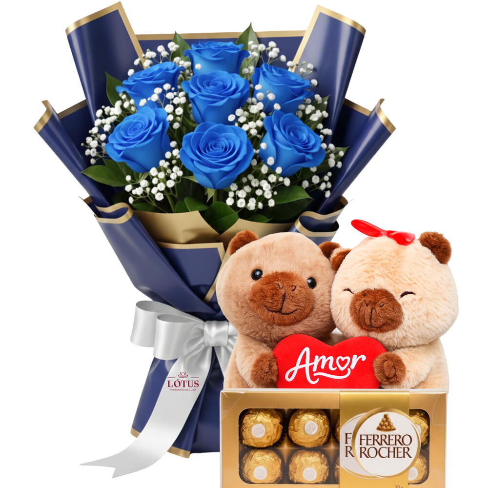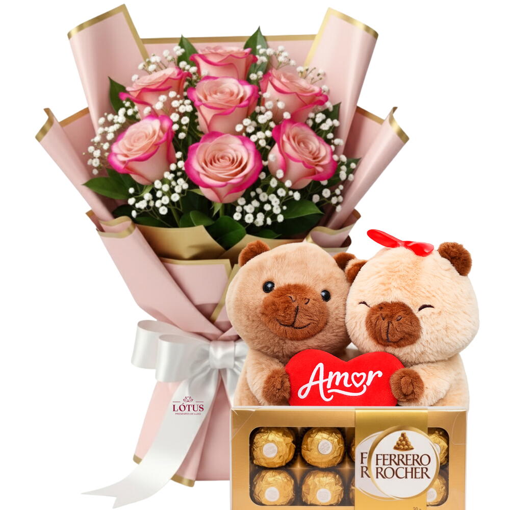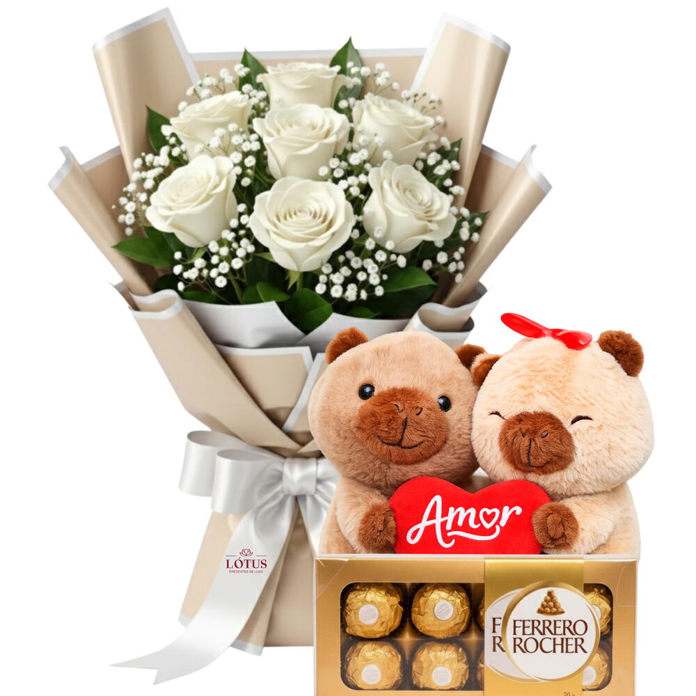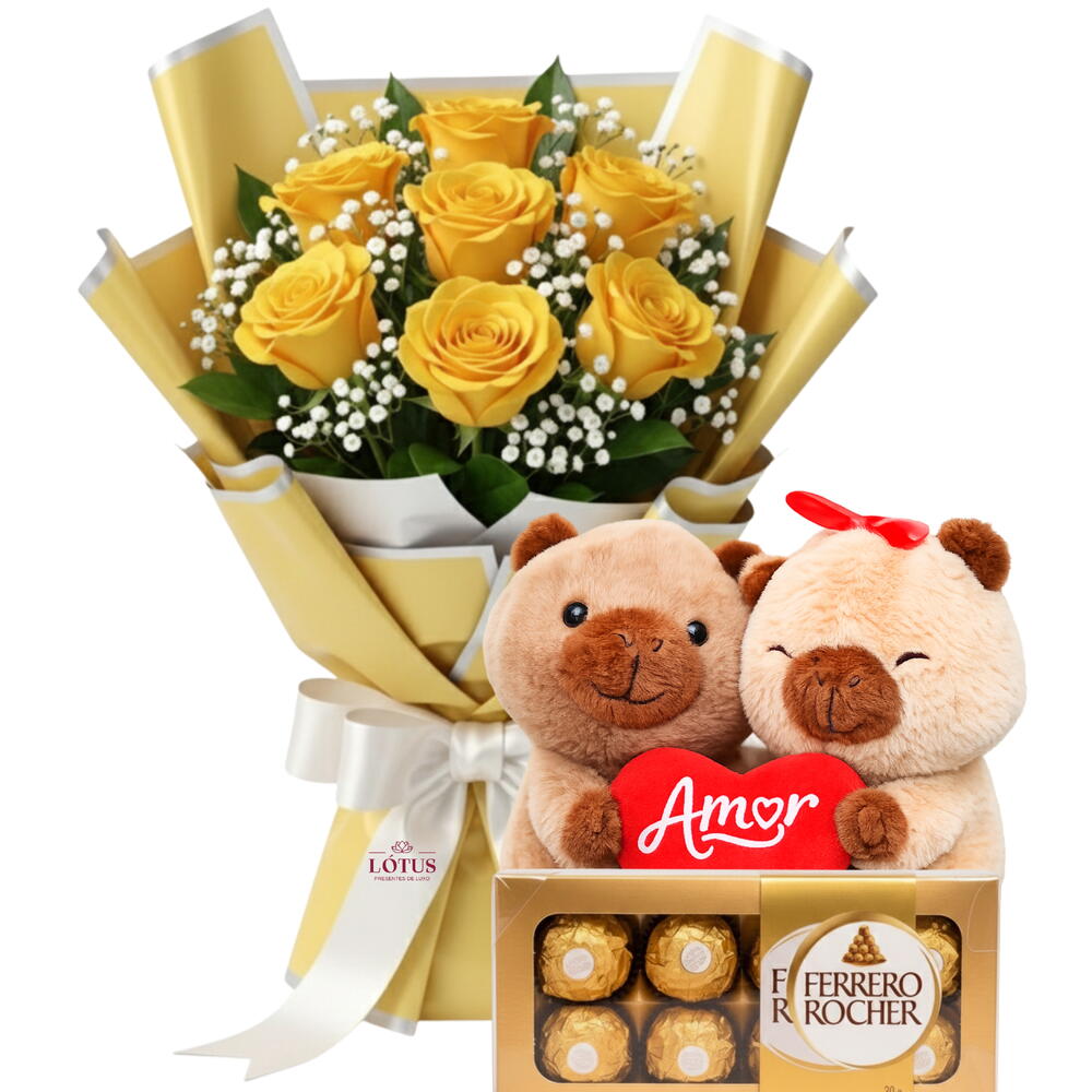 ENCANTE, SURPREENDA, EMOCIONE, COM: Buquê clássico de rosas vermelhas com pelúcia de capivara apaixonada e caixa de bombons Ferrero Rocher. Um presente completo, romântico e irresistível para declarar amor em grande estilo. ITENS QUE COMPÕEM O SEU PRESENTE Buquê de 7 rosas 1 pelúcia de capivara com coração “Amor” Caixa de bombons Ferrero Rocher de 8 unidades
