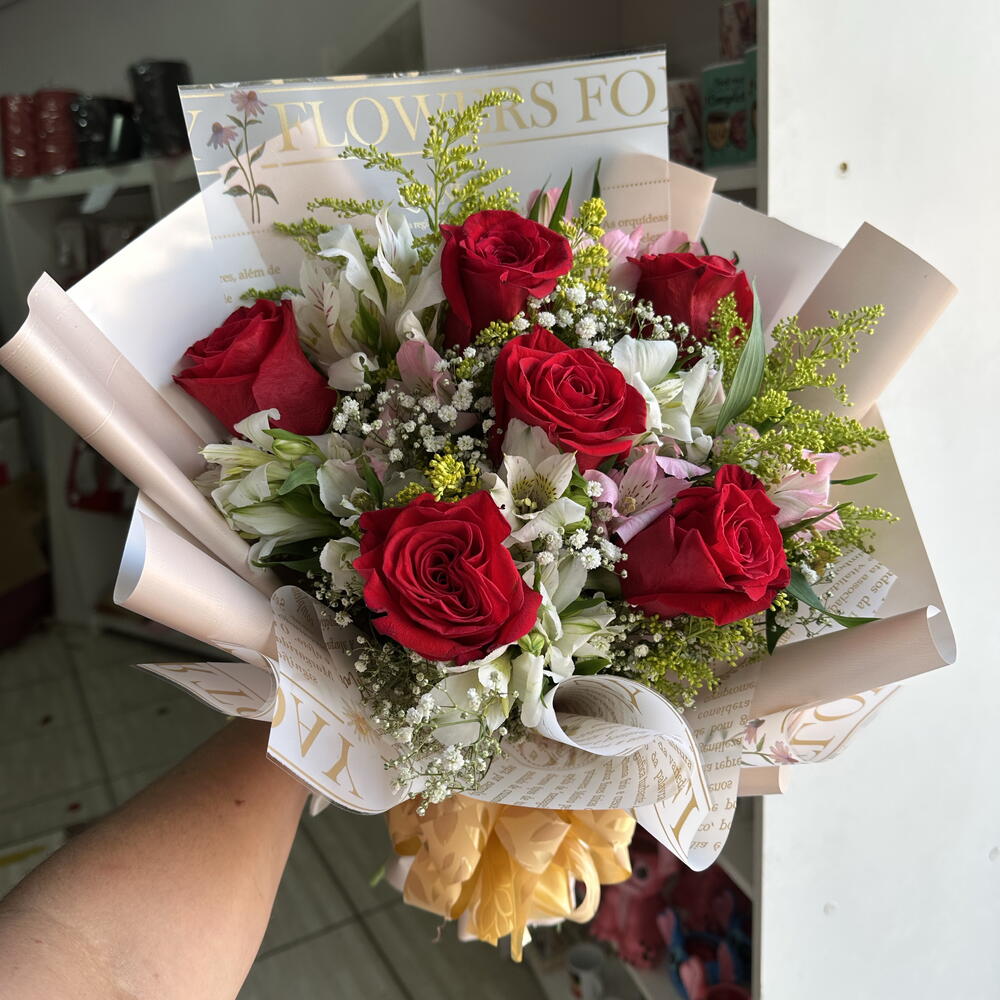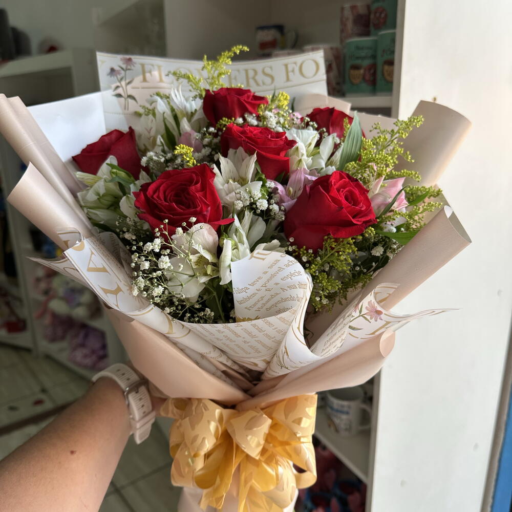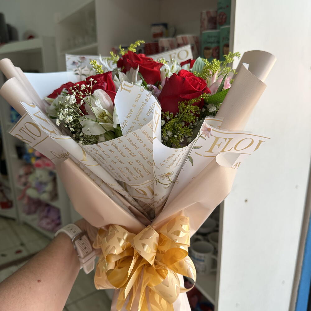rosa vermelha - 6 un. gipsofila - 8 un. alstroemerias (verificar disponibilidade de cores) - 8 un. tangos (flores ou detalhes decorativos) - 10 un. laço decoração - 1 un. embalagem dobradura - 1 un.