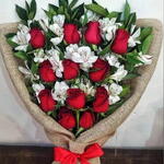 Esse deslumbrante buquê é composto por 12 rosas vermelhas vibrantes e 12 astromelias brancas delicadas, intercaladas com toques de ruscus para um toque de elegância. Cuidadosamente embalado em uma sacola de tela sofisticada e finalizado com um laço de cetim, este buquê é um presente perfeito para transmitir amor e apreço.