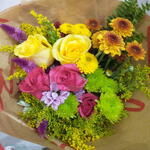 Lindo buquê composto por flores do campo, astrromélias, folhagem e 4 rosas coloridas