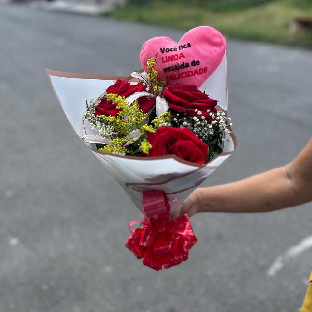 rosa - 3 un. folhagens - 1 un. laço - 1 un. almofada personalizada - 1 un. embalagem moderna - 1 un.