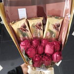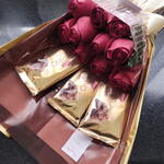 embalagem - 2 un. rosa vermelhas - 10 un. mosquitinhos - 1 un. barras de chocolate alpino - 3 un. laço em cetim - 1 un.