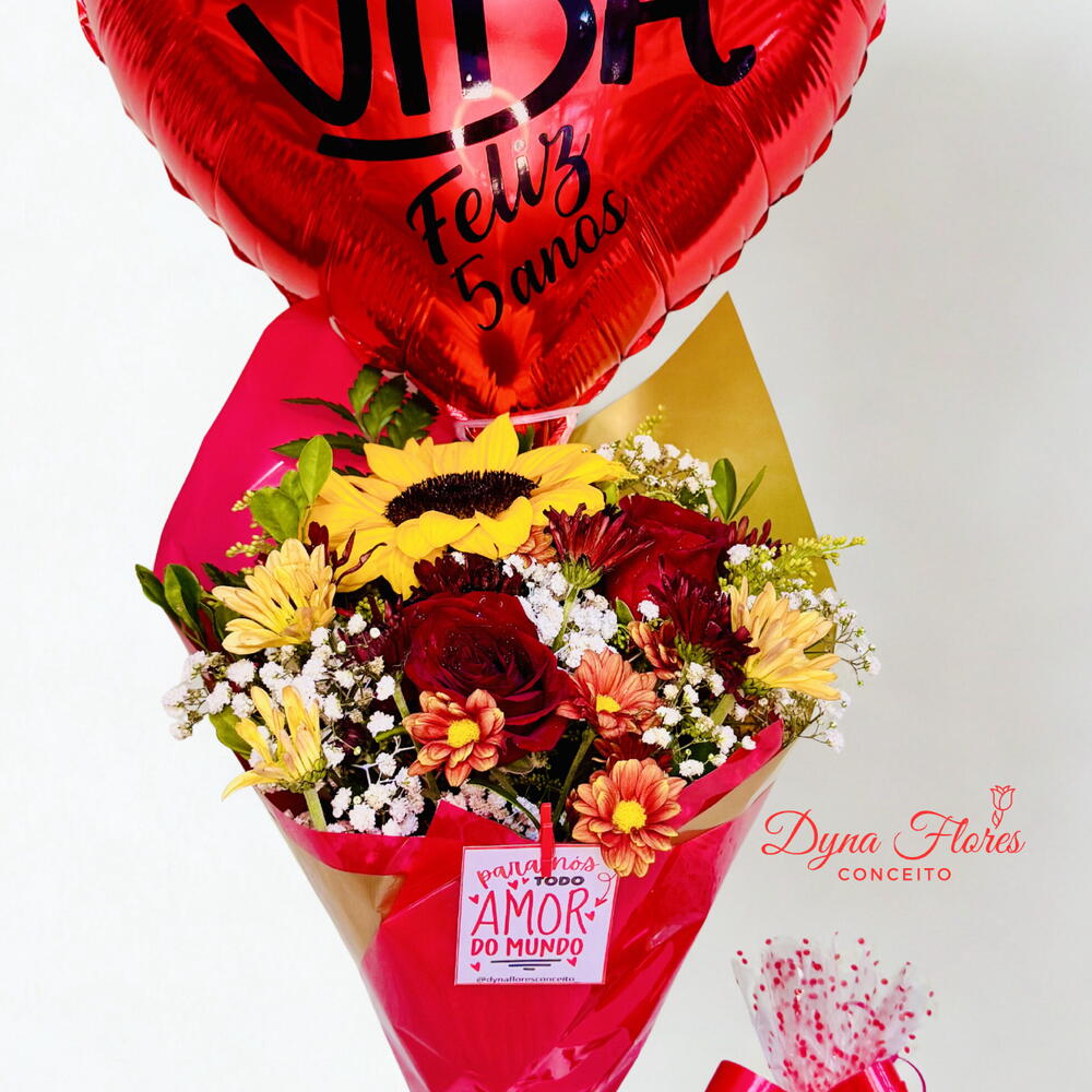 ferrero rocher t8 - 1 un. balão metalizado na vareta com personalização - 1 un. buquê com 2 rosa - 1 un. 1 girassol e complemento florais - 1 un.