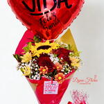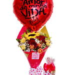 Encante alguém especial com este sofisticado buquê. Composto por uma unidade de Ferrero Rocher T8, uma unidade de balão metalizado em vara personalizada, uma unidade de um buquê com duas rosas, uma unidade de um girassol e complementos florais. É o presente perfeito para celebrar momentos importantes ou simplesmente para trazer um sorriso ao rosto de alguém.