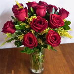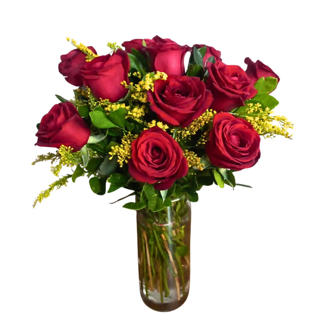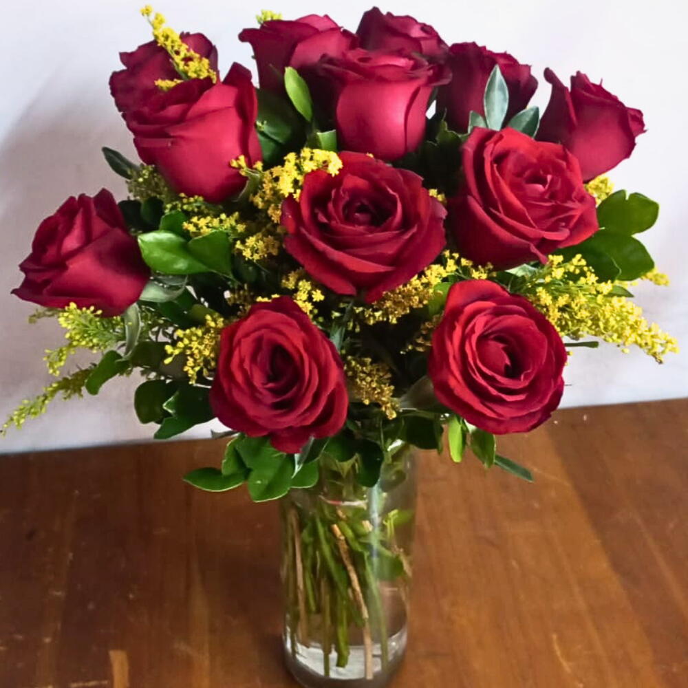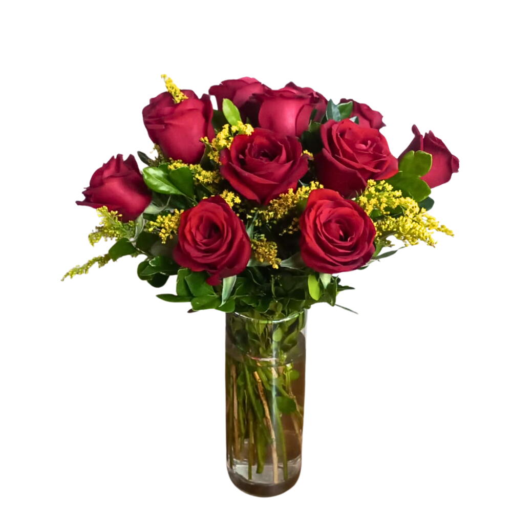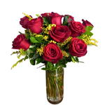 tango - 6 un. folhagens - 6 un. vaso de vidro - 1 un. rosa vermelhas - 12 un. laço de rafia - 1 un.