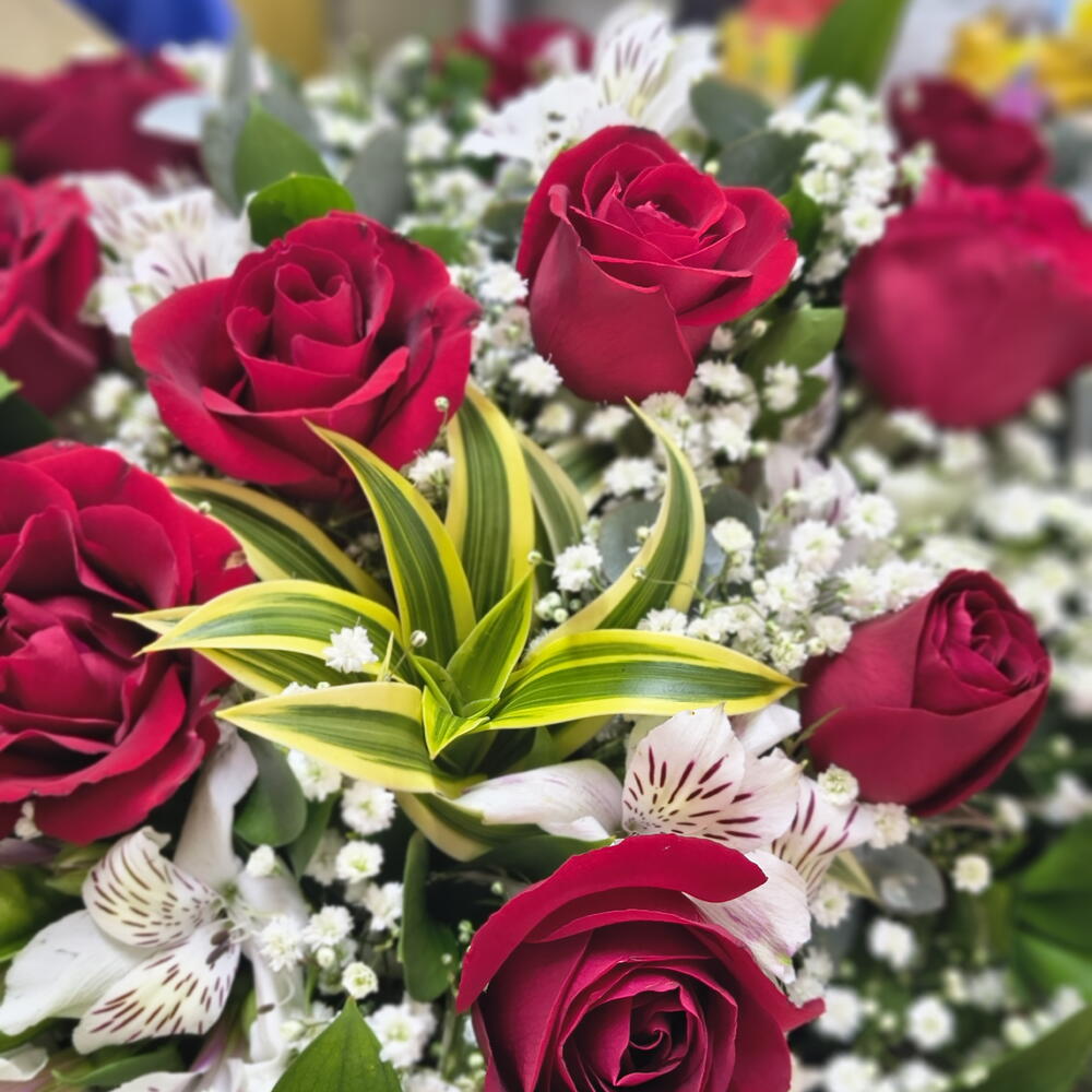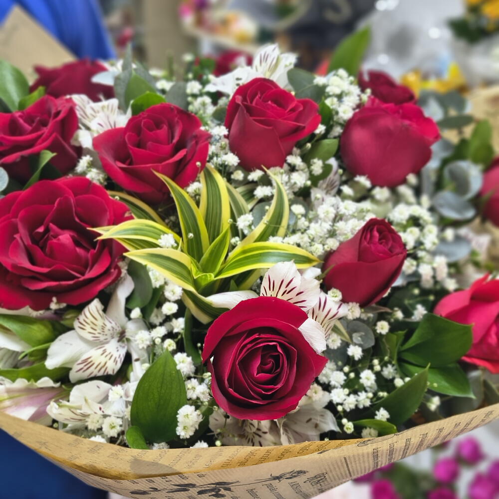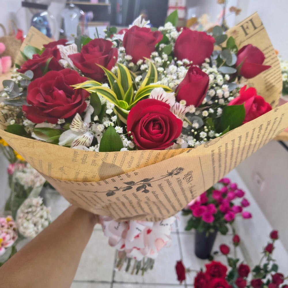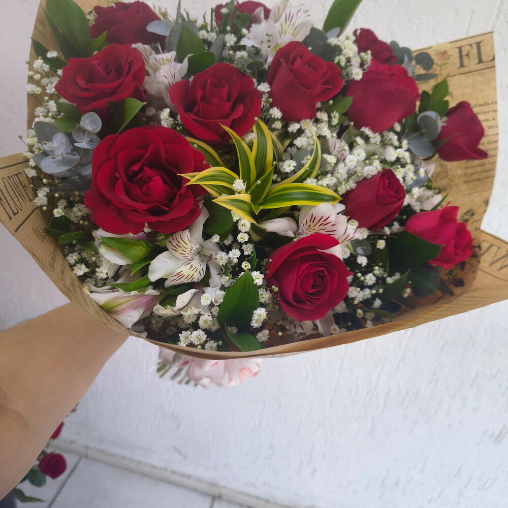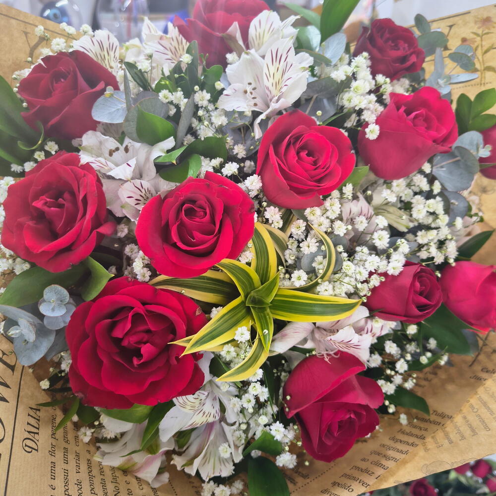 Este buquê é a personificação pura da elegância. Com 12 rosas requintadas, 10 astromelias atraentes e 1 preomele encantador, cada flor contribui para criar uma mistura harmoniosa de sofisticação. Cada item é cuidadosamente empacotado em uma única embalagem e acentuado por um laço delicado, conferindo a ele um toque final de elegância. Este buquê é um presente perfeito para todas as ocasiões, capaz de expressar sentimentos profundos de maneira bela e impecável.