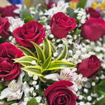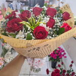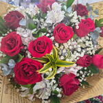 rosa - 12 un. embalagem - 1 un. laço - 1 un. astromelias - 10 un. preomele - 1 un.