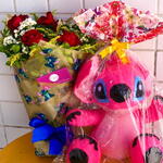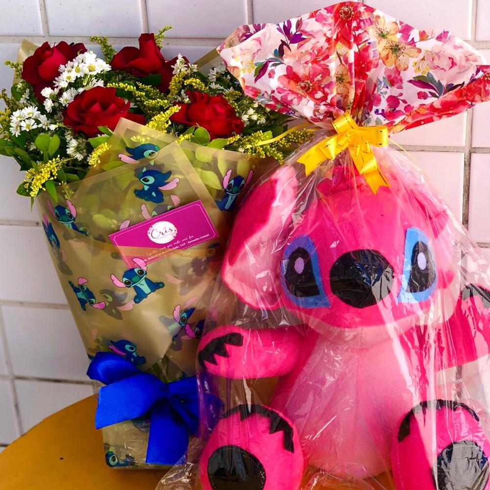 folhagens - 1 un. boca de leão - 1 un. rosa vermelhas - 4 un. embalagem celofane - 1 un. laço em cetim - 2 un. pelúcia angel 30cm - 1 un. embalagem personalizada stitch - 1 un.