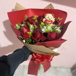 rosa vermelhas - 7 un. astromelias - 3 un. tango e folhagem - 15 un. mini urso - 1 un.