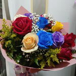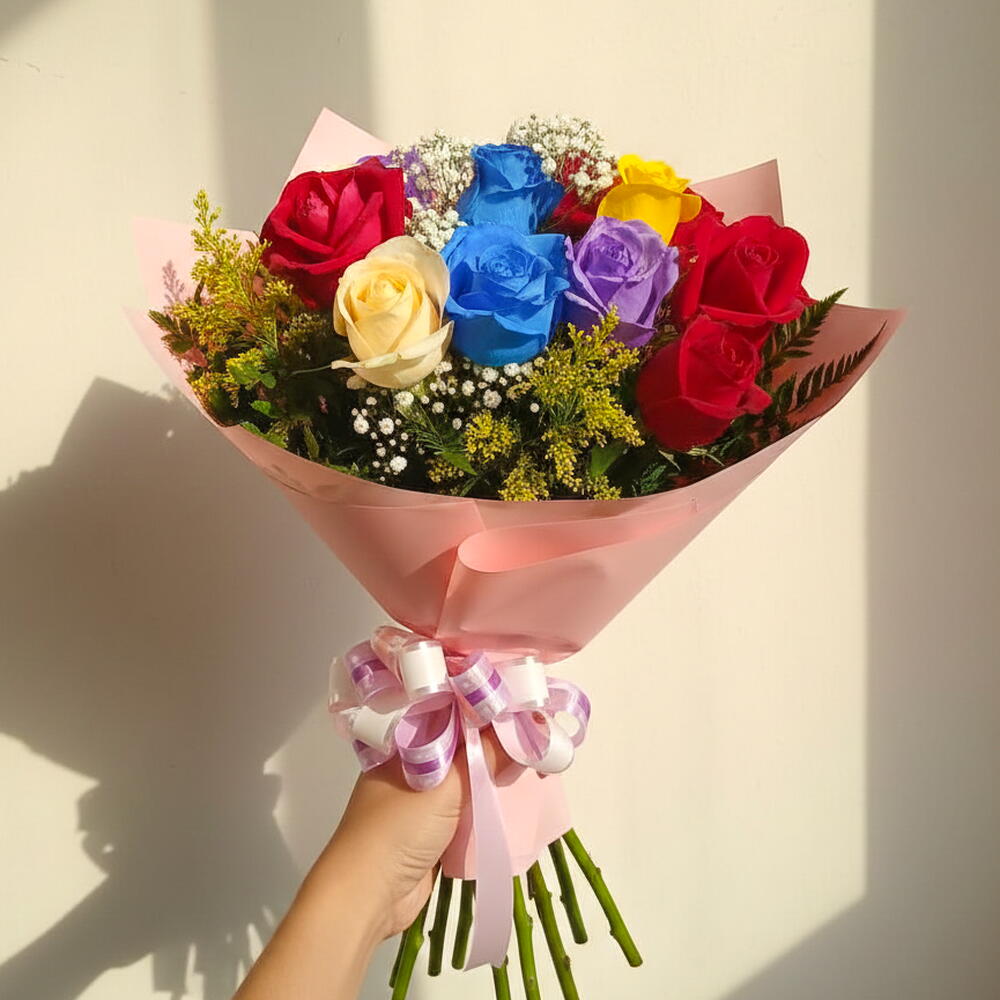Este buquê deslumbrante é uma composição harmoniosa de folhagem, 12 rosas de cores mistas e encantadora egypsofila, amarradas com um elegante laço. Apresentado em uma embalagem moderna, este buquê se transforma em um presente inesquecível, perfeito para qualquer ocasião especial.