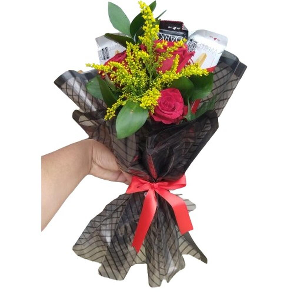 rosa - 3 un. embalagem - 1 un. folhagens - 1 un. laço - 1 un. barras de kit kat - 3 un.