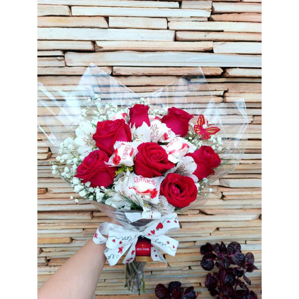 Este é um buquê sofisticado que combina o ardor das sete rosas vermelhas com a sutileza das flores brancas delicadas, astromelias e gypisophila. Ele é realçado pela singularidade de um aspargo e uma delicada borboleta, e envolvido em uma embalagem transparente delicadamente atada com um laço. Para completar esta oferta elegante, o buquê é acompanhado por seis deliciosos bombons Rafaello, proporcionando uma experiência sensual de sabor e aroma. Este buquê não é apenas um presente, mas uma experiência inesquecível.