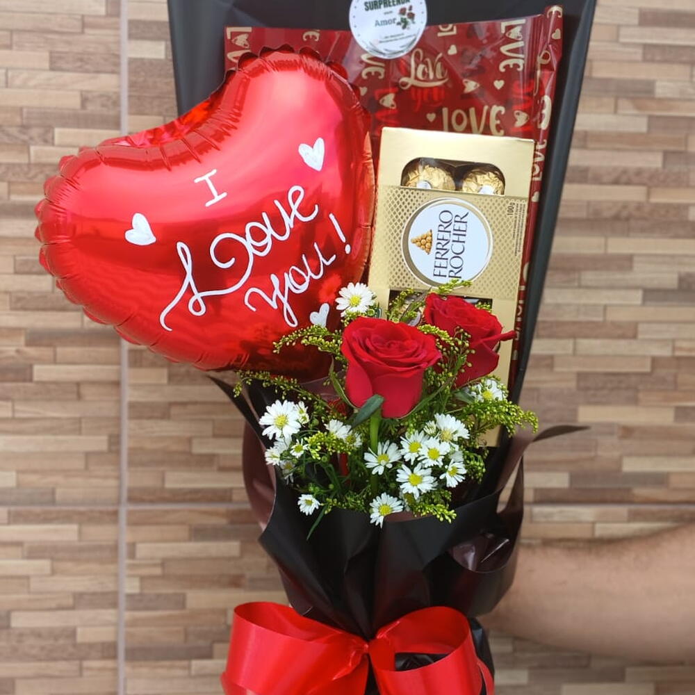 folhagens - 1 un. laço - 1 un. rosa vermelhas - 2 un. balão i love you - 1 un. cx ferreiro rocher - 1 un. embalagem tipo coreana - 1 un.