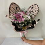 Este buquê encantador é composto por 3 flores de lirios, realçada por cinco unidades de folhagens luxuriantes. Tudo é cuidadosamente embalado em uma embalagem elegante formato borboleta, criando um presente perfeito que exala elegância e sofisticação.