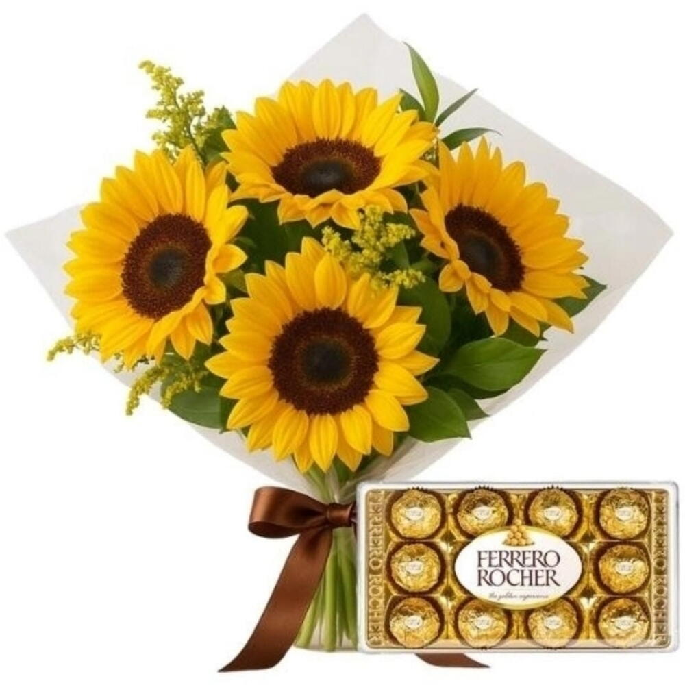 Este deslumbrante buquê combina a frescura das folhagens verdes, a alegria irradiante de 4 girassóis naturais, majestosamente amarrado com um laço especial. Envolto em uma elegante embalagem de celofane, vem com uma deliciosa surpresa – uma caixa de chocolates Ferrero Rocher de 12 unidades. Uma escolha perfeita para impressionar e encantar em qualquer ocasião.