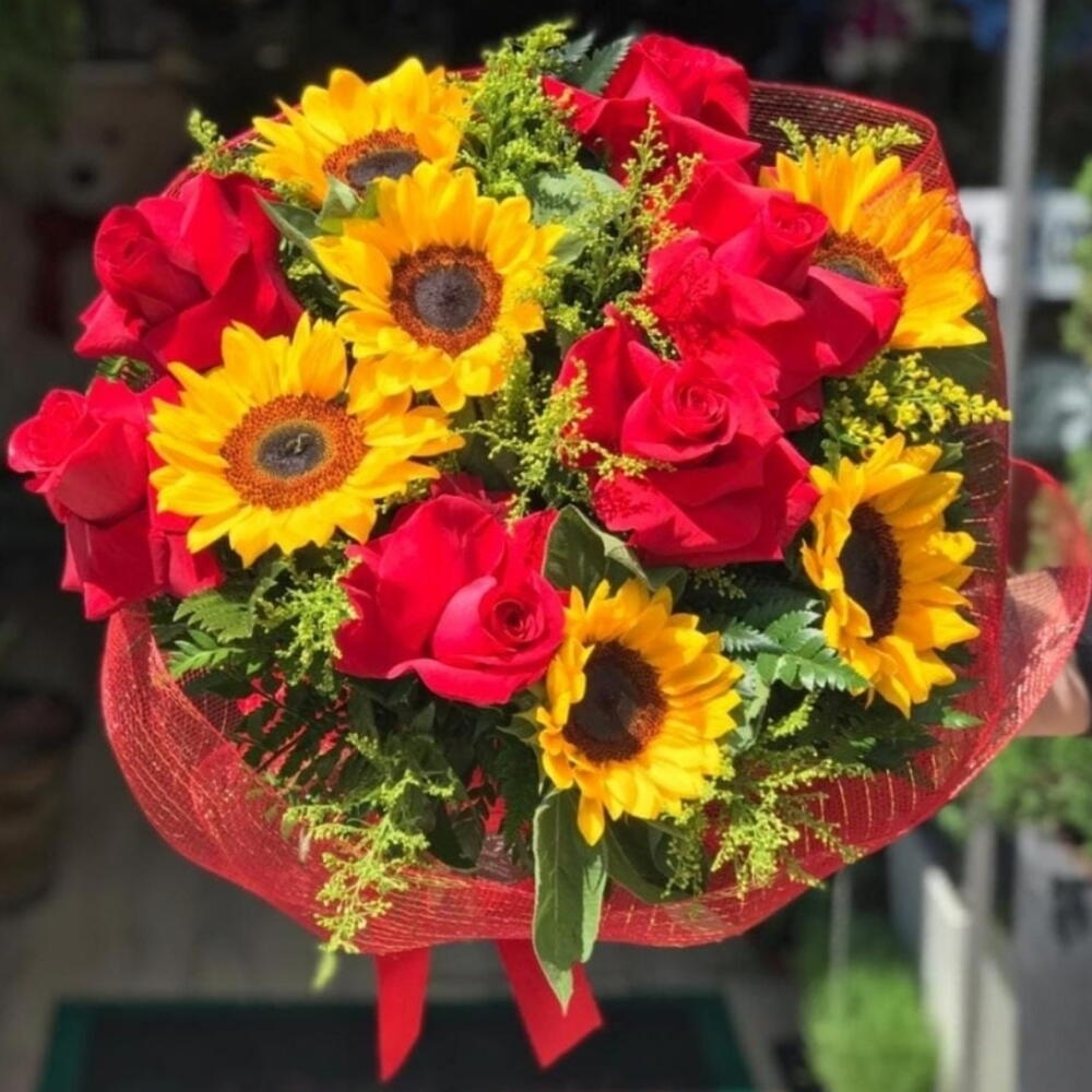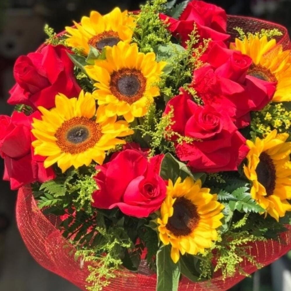 Este esplêndido buquê é composto por uma bela folhagem e seis radiantes girassóis, cujo brilho é ainda mais destacado pela presença de seis elegantes rosas vermelhas. O arranjo é delicadamente unido por um laço especial e apresentado em uma luxuosa embalagem vermelha em tela especial. Um presente perfeito que combina a alegria do girassol com a paixão das rosas vermelhas.